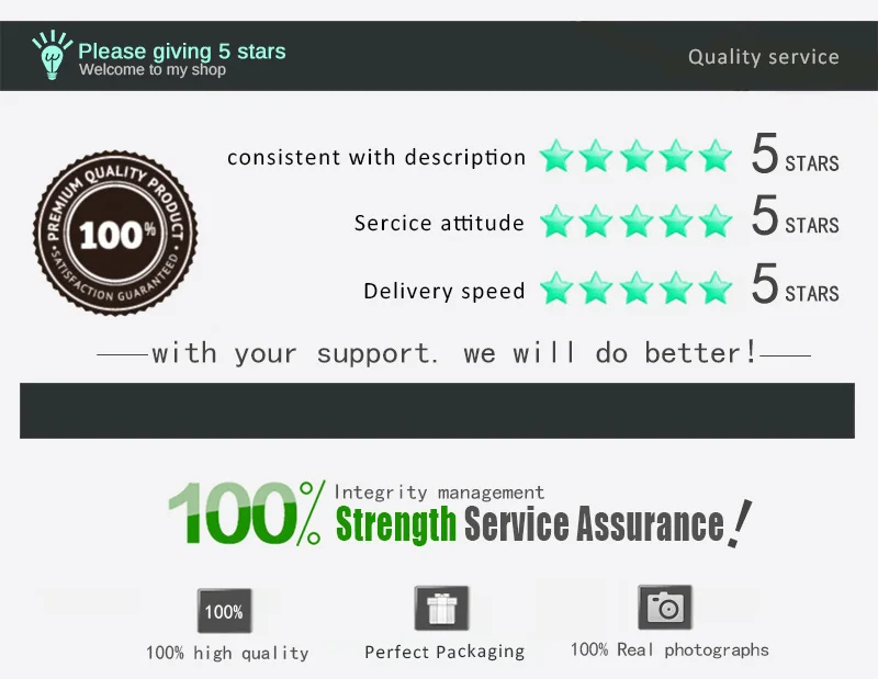 3. Если вы удовлетворены, пожалуйста, оставьте нам положительный отзывы с пятью звездами; Если вы не удовлетворены, пожалуйста, свяжитесь с нами, прежде чем оставить нам нейтральные, негативные отзывы или открыть спор, мы предложим лучший сервис, пока вы не удовлетворите.