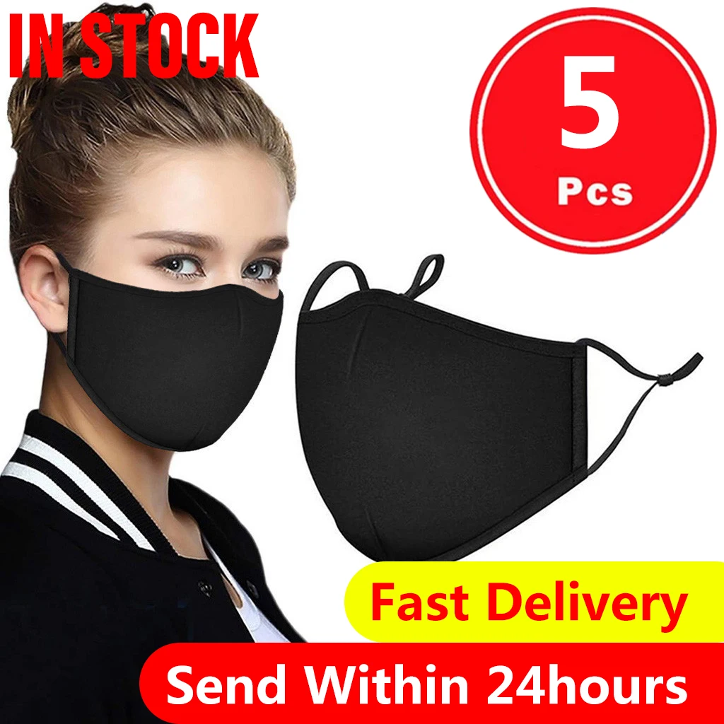 Маска для лица черная хлопковая непромокаемая многоразовая, 5 шт.