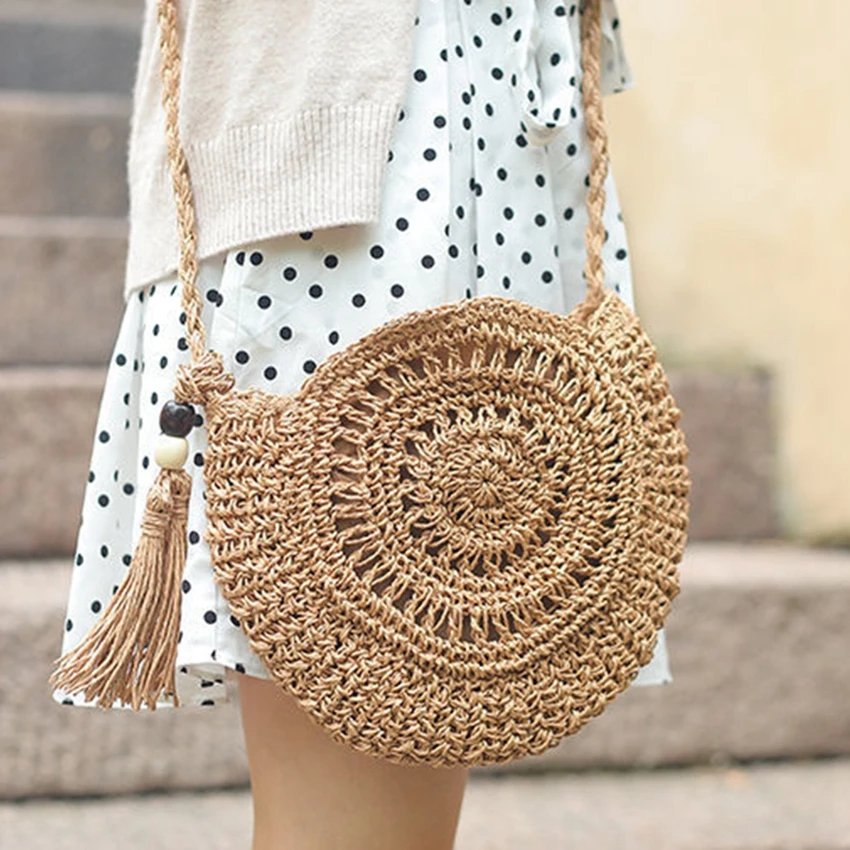 Круглая пляжная сумка из рафии, винтажная плетеная сумочка ручной р...