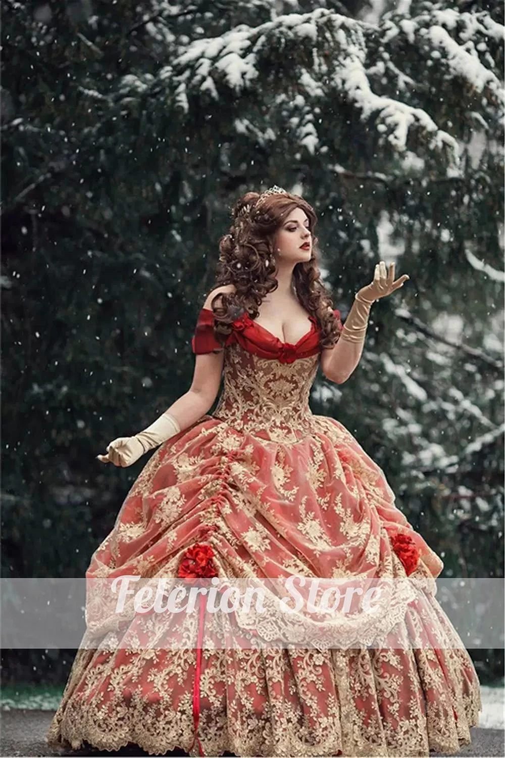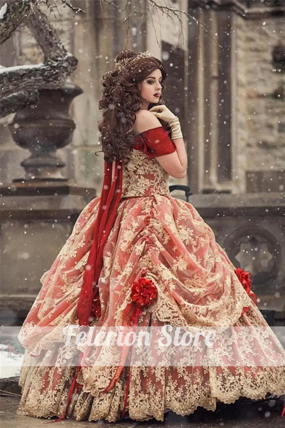 Винтажные золотистые кружевные красные платья для косплея милое 16-летнее сексуальное длинное платье для выпускного вечера с оборками Лиф-корсет
