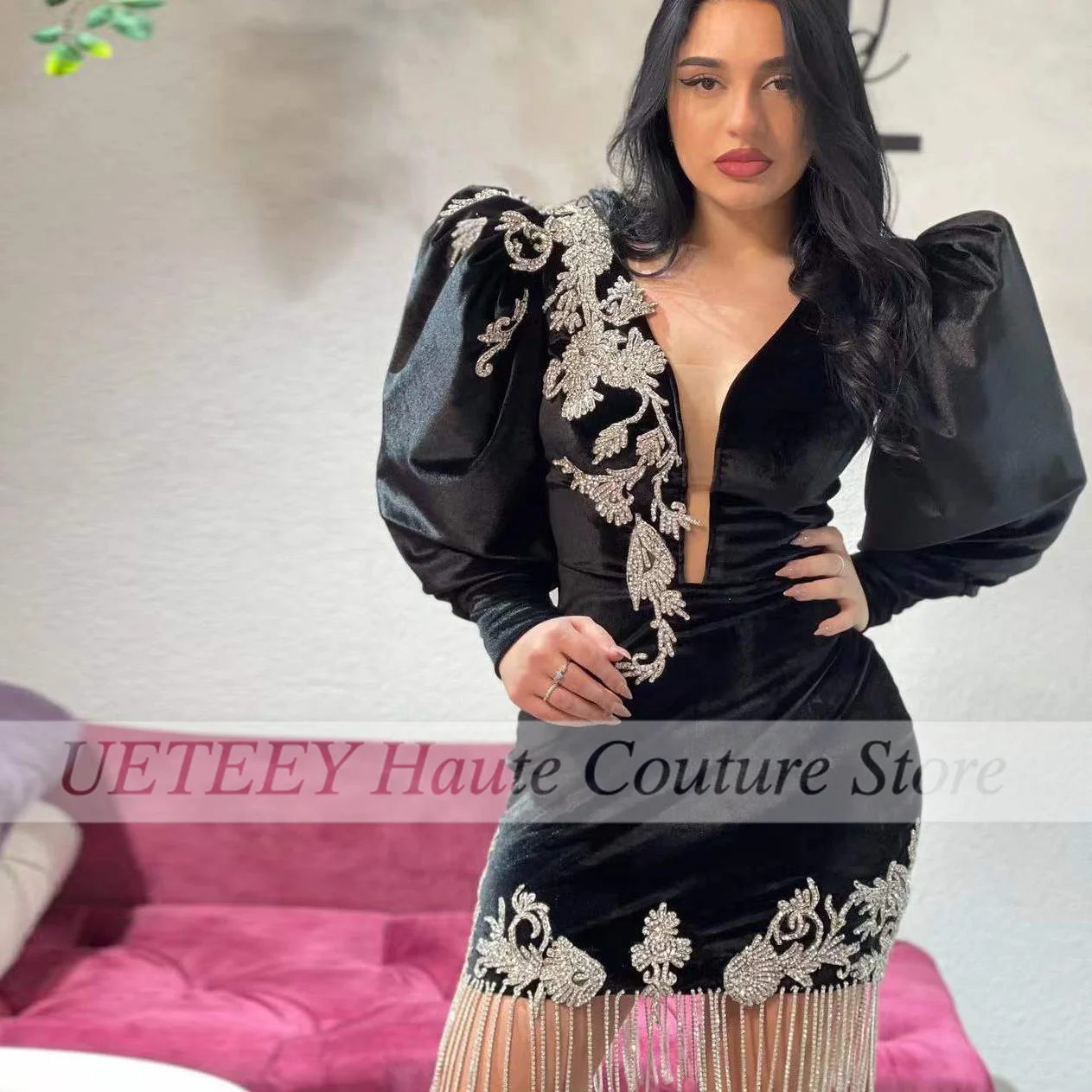 Черные роскошные вечерние платья с глубоким V-образным вырезом, короткое платье для выпускного вечера, коктейльное мини-платье с длинным рукавом, мужские платья, вечерние платья