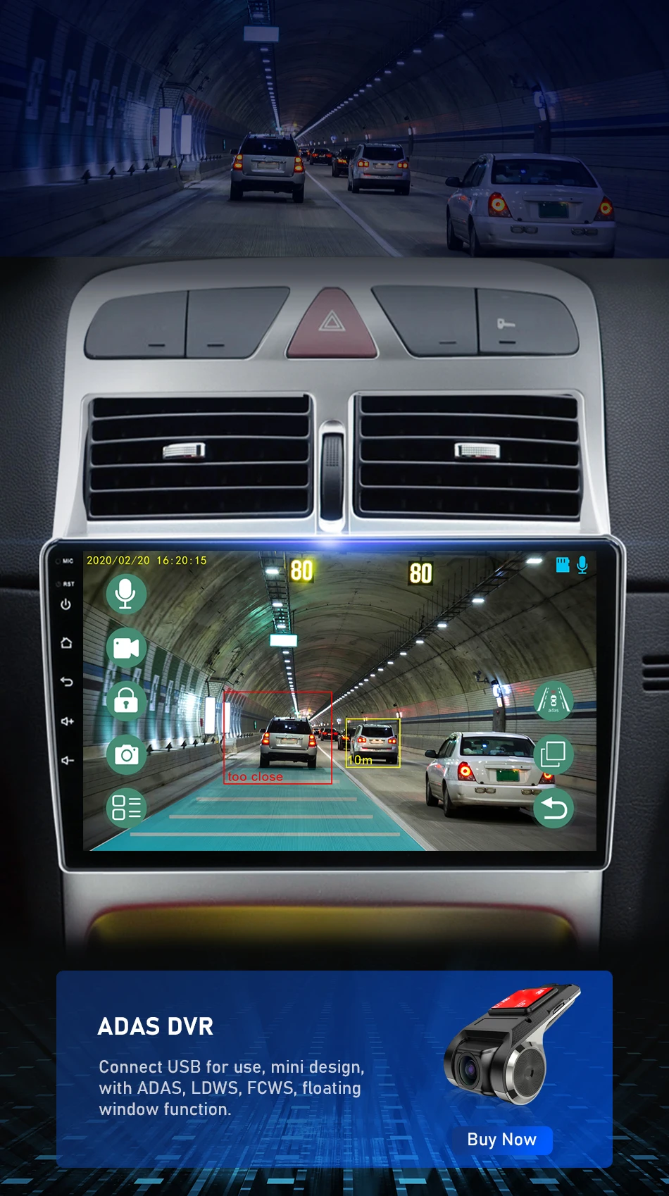 Поддерживает подключение к видеорегистраторУ ADAS. ADAS DVR имеет несколько встроенных ассистивных технологий вождения, вставляя высококачественную карту памяти TF для записи каждого момента вашего вождения.