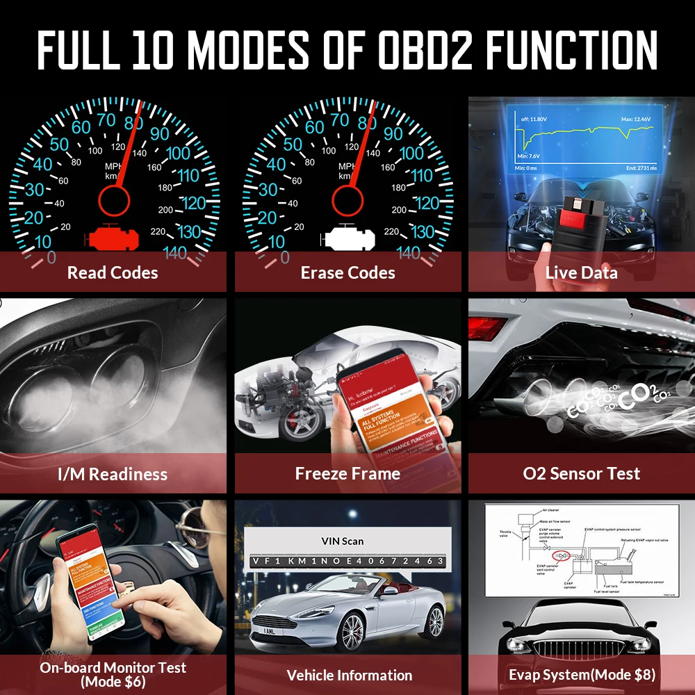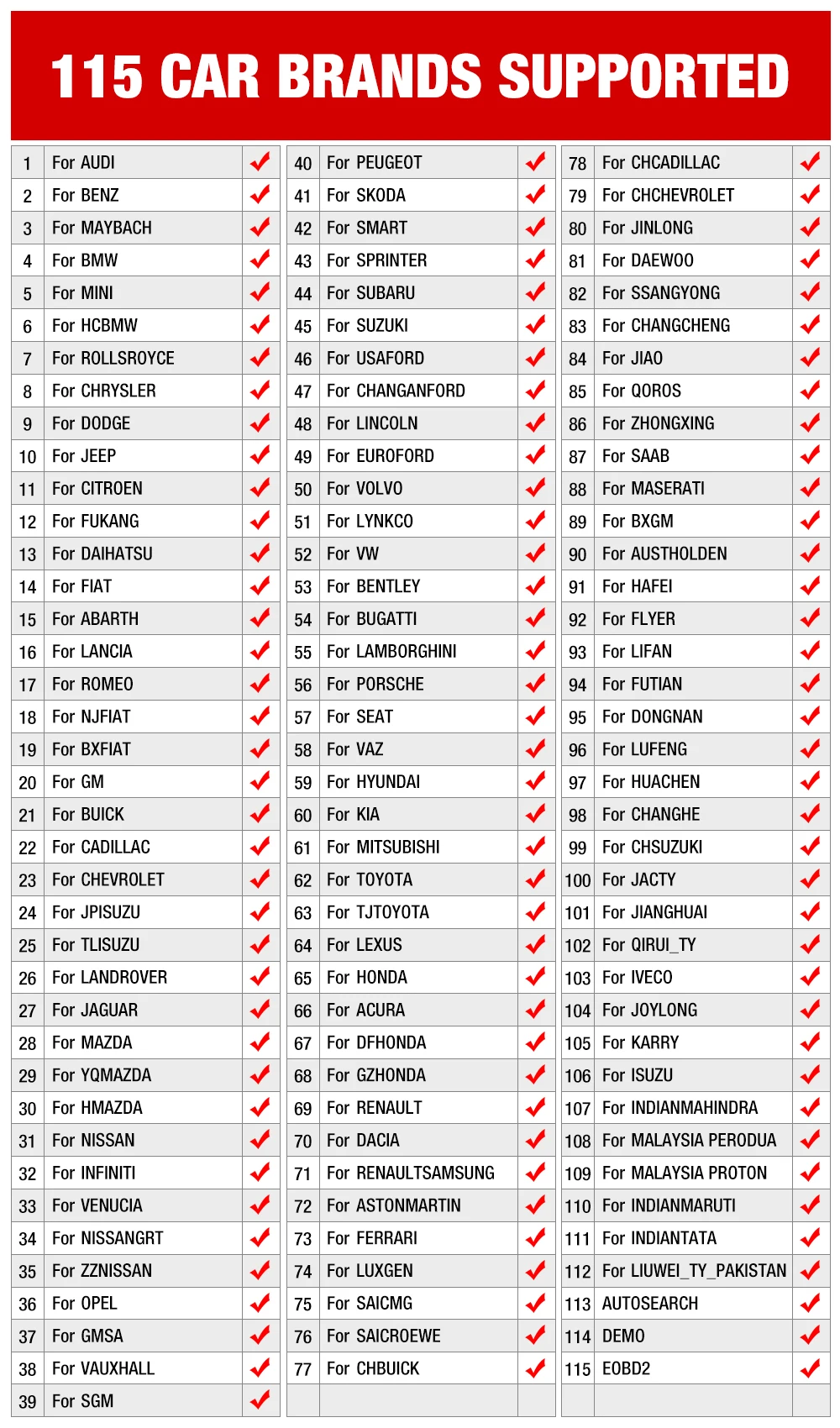 Для диагностики OBDII устройство считывания кодов obd2 отлично подходит для большинства автомобилей, построенных в 1996 году или более поздней версии, совместимо со следующими протоколами:-ISO 14230-4 (KWP2000)-ISO 15765-4 (CAN)-ISO 9141-2 (iso)-ISO 14229 (uds)-SAE J1850 (VPW & PWM)-Оригинальные протоколы производителейДля расширенных функций, как активный тест, все системы диагностики и обслуживания, он охватывает 95% моделей автомобилей, доступных на рынке, включая: