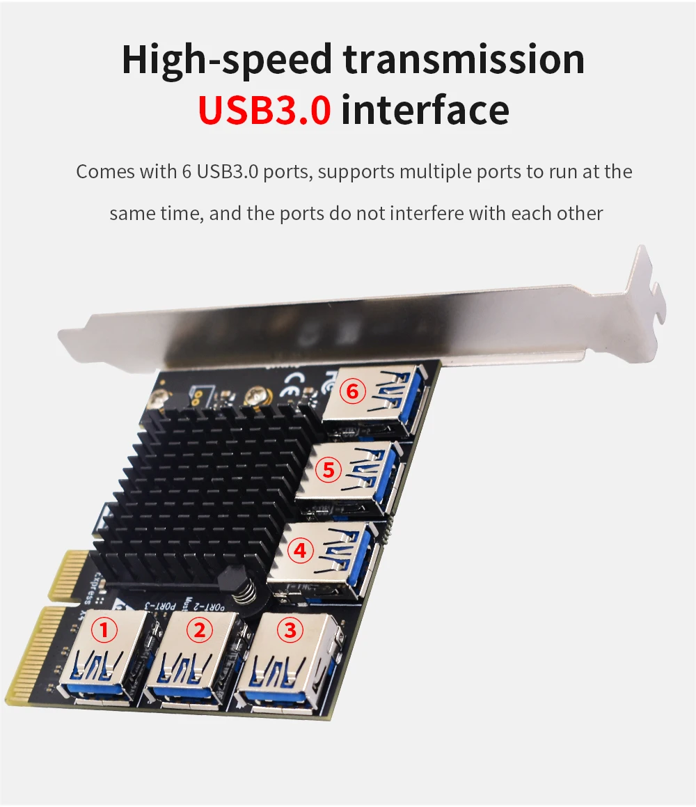 Райзер TISHRIC PCI Express с 1 до 6 портами USB 3,0 PCI-E Hub, Райз...