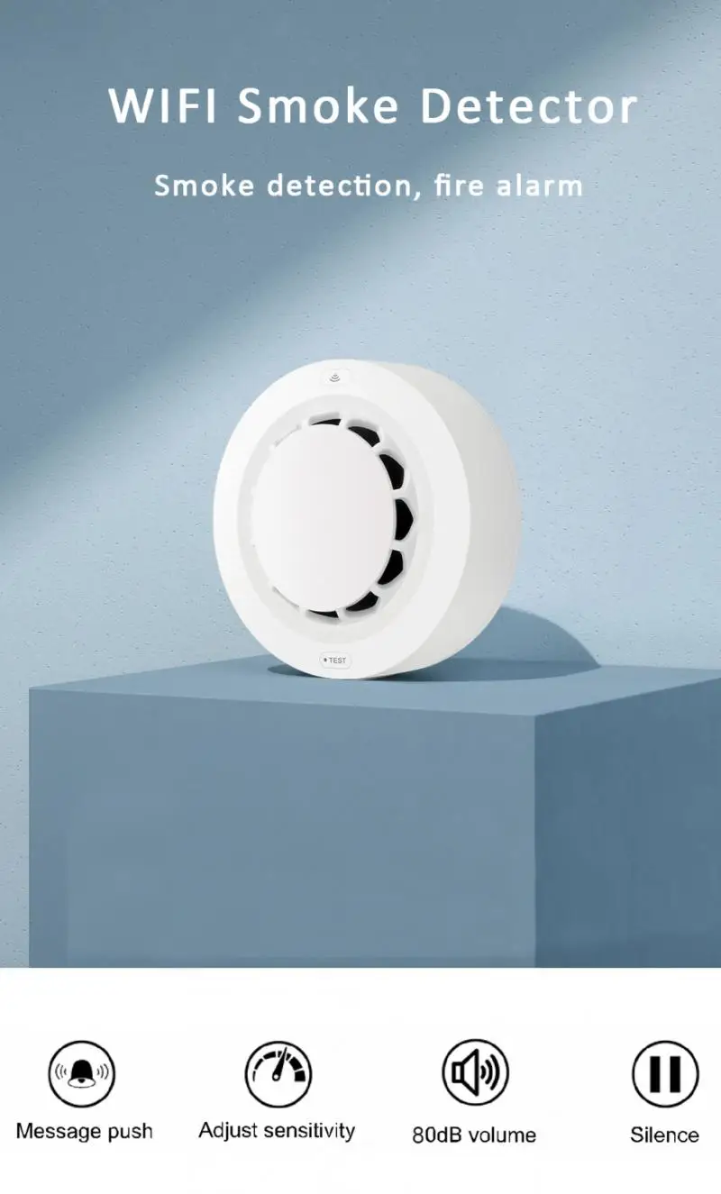 Этот продукт является умным WIFI фотоэлектрическим датчиком дыма. Он способен в режиме реального времени обнаруживать наличие дыма. После обнаружения опасности пожарного дыма, красный светодиодный датчик будет включен, и