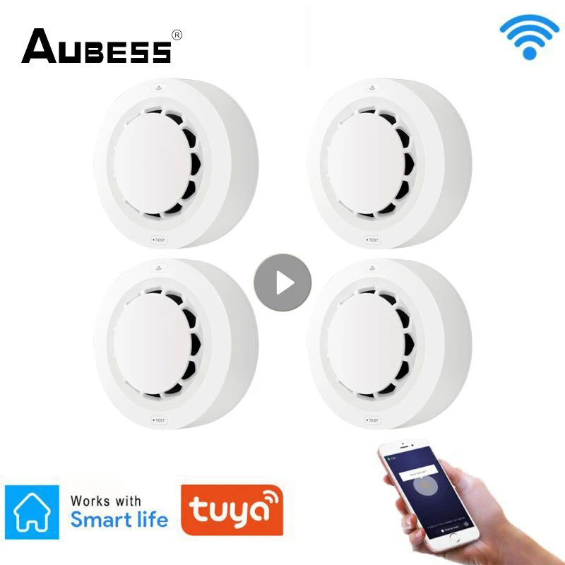 Датчик дыма Aubess Tuya с Wi-Fi, детектор огня, звуковая светильник сигнализация, беспроводное управление через приложение