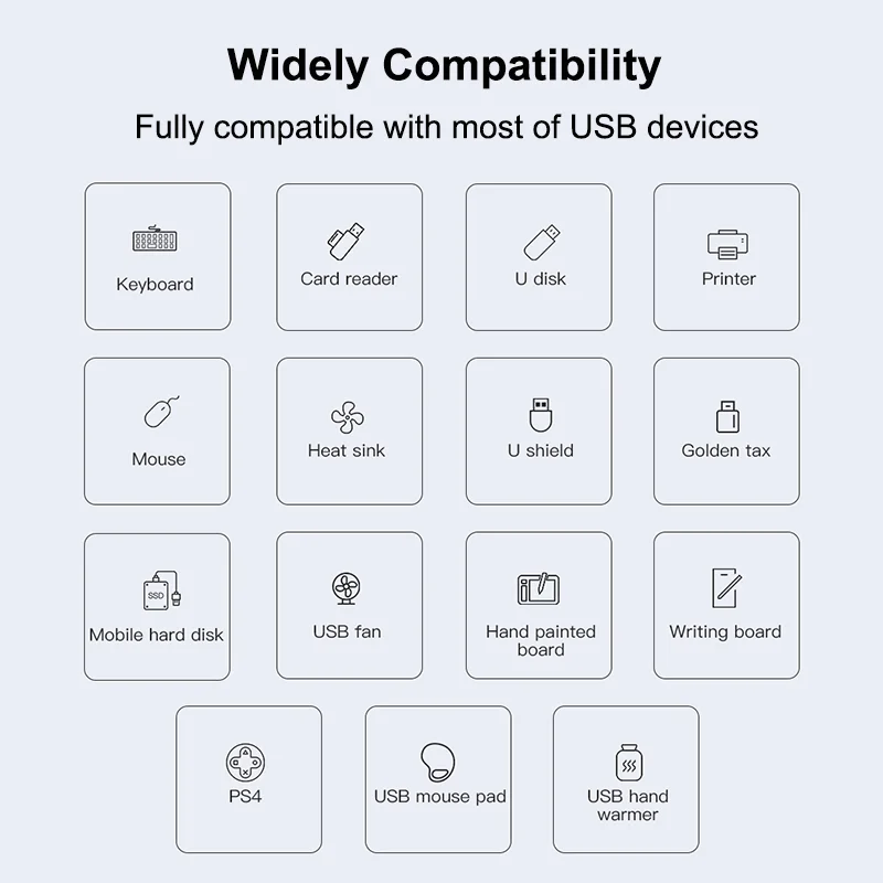 ПолностьюСовместим с большинством usb-устройств, клавиатуры, мыши, u-диска, камеры,Usb-гарнитура, принтер, usb-кабель, микрофон, игровые автоматы, usb-вентилятор,Компьютер, ноутбук и т. Д.