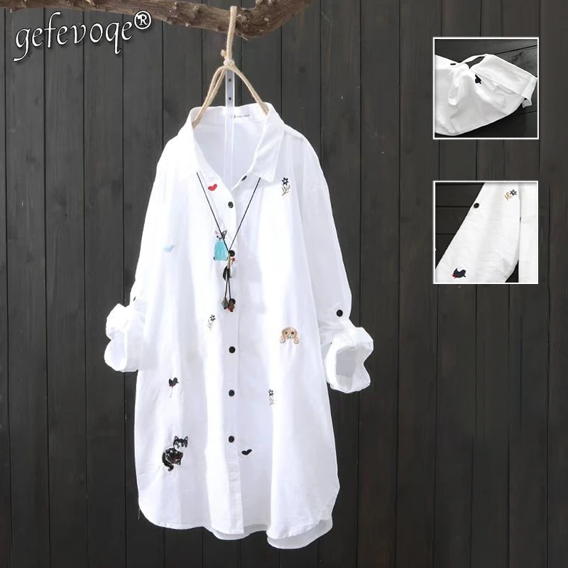 Женская свободная рубашка из чистого хлопка, белая универсальная тонкая рубашка средней длины с вышивкой, большие размеры, новинка весны 2022