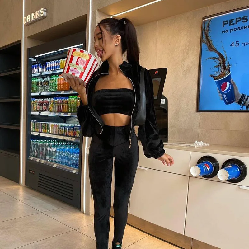 Женский бархатный костюм из трех предметов, однотонный уличный кост...