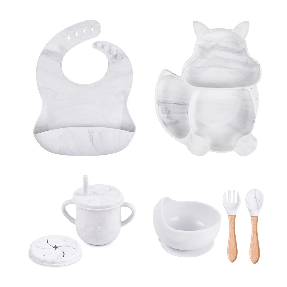 Новые цвета, набор для кормления, силиконовые нагрудники пищевого качества, Детская тарелка, нескользящая, всасывающая чаша, детская посуда, водонепроницаемый нагрудник, BPA, Бесплатная ложка100% пищевой силикон, нетоксичный, без BPA, свинца, кадмия, фталатов, ПВХ и латексаПосылка включает в себя: 1 Силиконовая ложка + 1 силиконовая вилка + 1 чаша + 1 нагрудник + 1 тарелка + 1 деревянная ложка + 1 деревянная вилка + 1 соломенная чашкаСильная присоскаВысокая термостойкость: без повреждений при температуре 220 градусовПодходит для микроволновой печиЛегко чистить, мыть в посудомоечной машине
