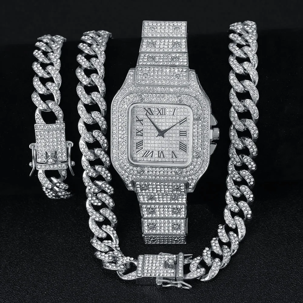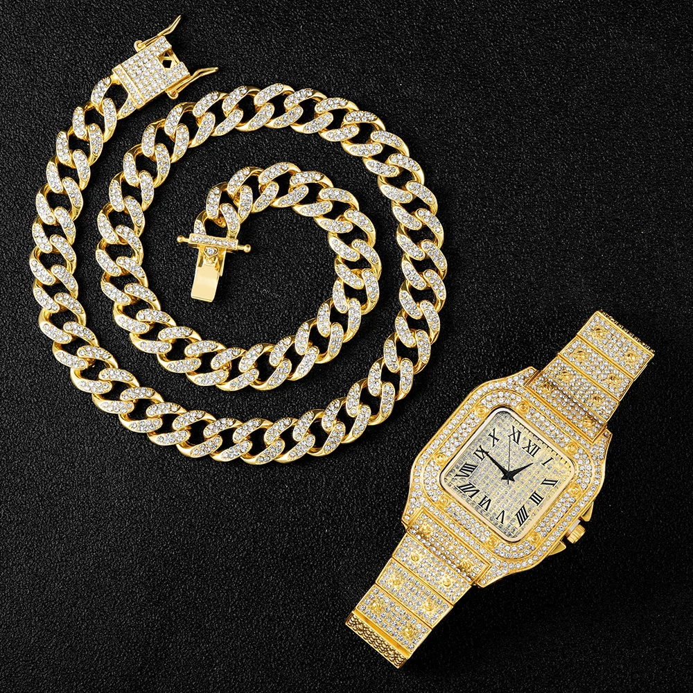 Ожерелье + часы + браслет из нержавеющей стали хип-хоп МАЙАМИ панцирная кубинская цепь украшенная камнями Стразы для мужчин ювелирные изделия