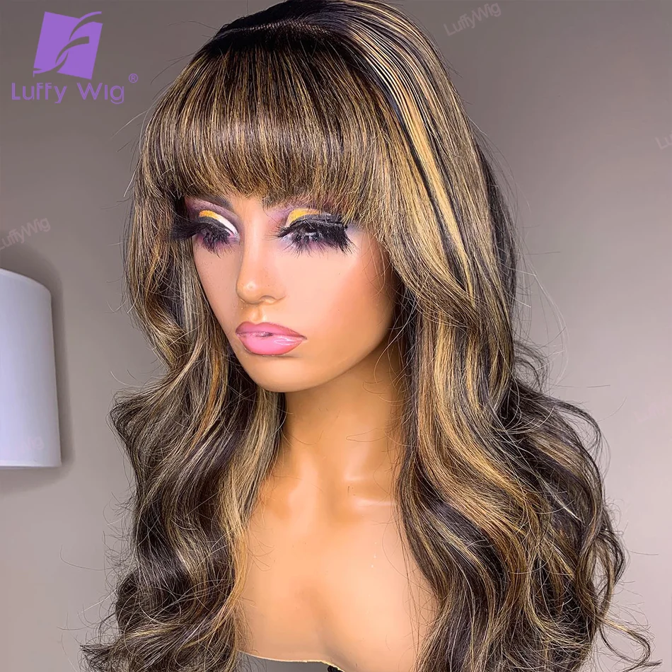 Хайлайтер светлый тело волнистые человеческие волосы парик с челкой безклеевой головы цветной полный парик машинная работа Remy бразильский для женщин Luffy