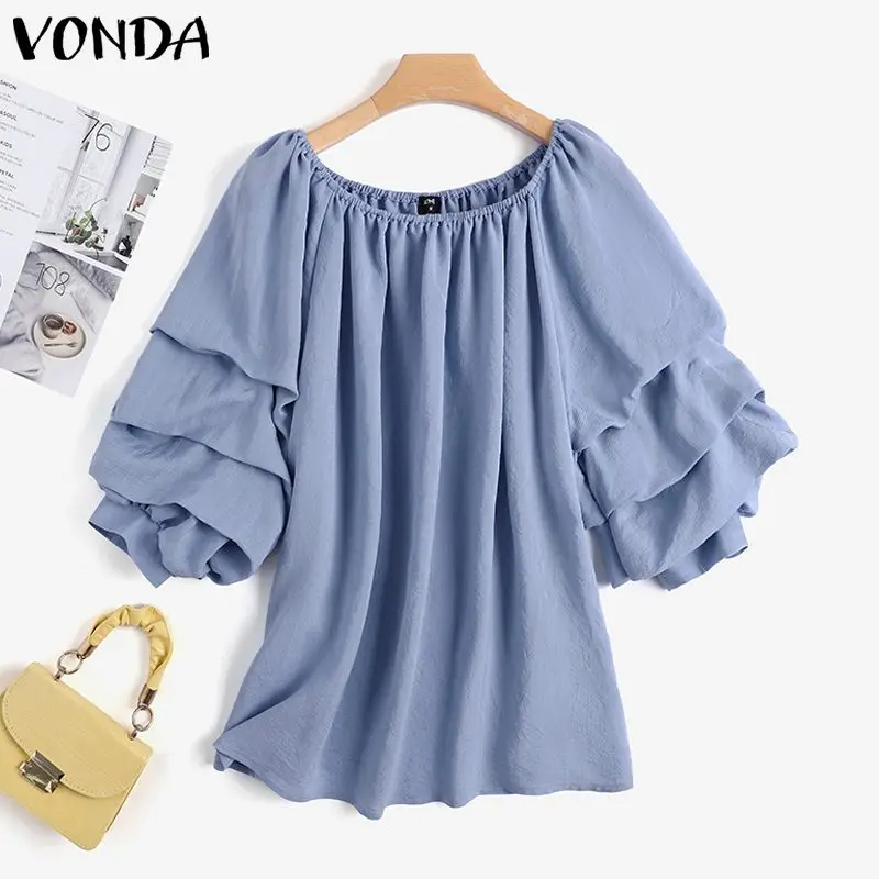 VONDA женские летние рубашки 2022 Повседневная однотонная блузка с рукавом 34 мешковатые плиссированные топы офисные женские блузы большого размера