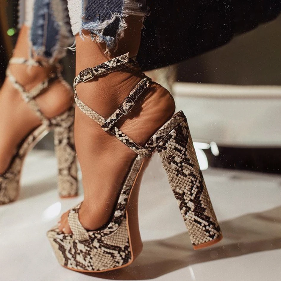 Женские босоножки со змеиным принтом, на высоком массивном каблуке