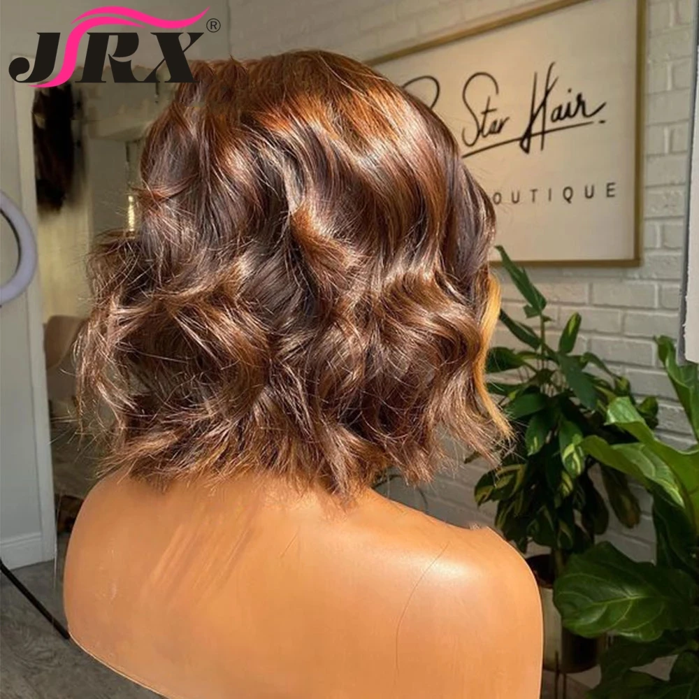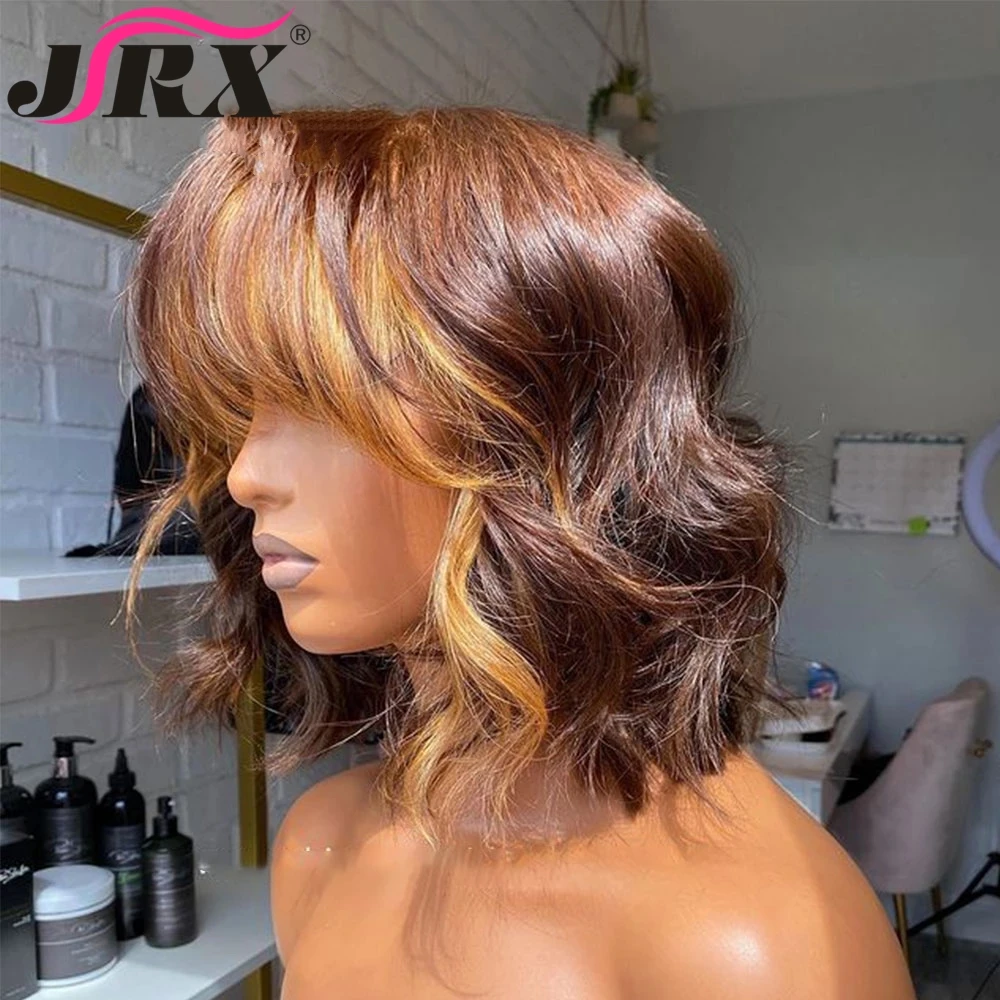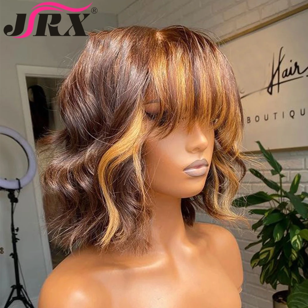 Медовая блондинка короткие вьющиеся человеческие волосы парик с челкой полностью машинное изготовление перуанских натуральных волн хайлайтер цветные Remy парики для женщин