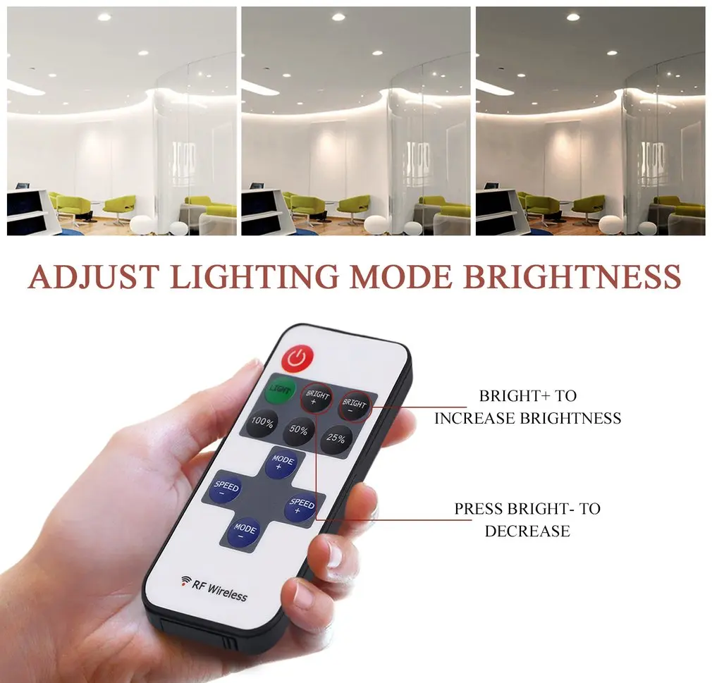 Особенности:Инструкции для радиочастотного беспроводного пульта ДУВключение/режим ожиданияНажмите эту клавишу, чтобы включить устройство или переключиться в режим ожидания. Устройство включится и восстановит предыдущий статус при включении.Режим освещенияПереключение в режим освещения из динамического режима.Диммер настраивает ярлыкиПереключение на 100%, 50% или 25% режим яркости освещения.Настройка динамического режимаПереключение в динамический режим из режима освещения или переключение между различными динамическими режимами.Регулировка скоростиРегулировка скорости воспроизведения динамических режимов. Нажмите скорость + для увеличения семян и нажмите скорость-для уменьшения.Регулировка яркости (диммер)Регулировка яркости режима освещения. Нажмите BRIGHT + для увеличения яркости и нажмите BRIGHT-для уменьшенияОписание:Функции для радиочастотного беспроводного пульта дистанционного управленияДиммер и динамический8 динамических эффектов10 уровней диммер256 класс ШИМРегулируемая скоростьПульт дистанционного управления типа картыУльтратонкий дизайнЭффект плавного диммераОт 1 до 1 пульт дистанционного управления в пареФункция автоматического сохраненияИнструкции:1. Источник питанияЭтот блок принимает DC 5V до 24V источник питания. Красный кабель должен быть подключен к положительному и Черному кабелю к отрицательному.Пожалуйста, выберите правильный источник питания в соответствии с светодиодный-приложением.2. Светодиодный выходКрасный кабель должен быть подключен к положительному и черно-светодиодный кабелю к отрицательному. Пиковый выходной ток 12А, пожалуйста, уменьшите нагрузку, если основной блок перегревается.Внимание: Не замыкайте светодиодный выход, это может привести к постоянным повреждениям!3. Пульт дистанционного управленияПожалуйста, вытяните изоляционную часть перед использованием. Радиочастотный беспроводной дистанционный сигнал может проходить через барьер, поэтому нет необходимости нацеливать на основной блок при эксплуатации. Для правильного приема удаленного сигнала не устанавливайте основной блок в закрытых металлических частях.Примечание: дистанционный аккумулятор 3 в типа CR2025 (не входит в комплект)Спецификация:Динамический режим: 8 режимовДинамический уровень скорости: 10 уровнейУровень яркости освещения: 10 уровнейКласс ШИМ: 256 классовЭффект плавного диммера: ДаРабочее напряжение: 5 ~ 24 В постоянного токаВыходной ток: пик 12АРежим дистанционного управления: Беспроводной RFЧастота дистанционного управления: 433,92 МГцУдаленное Расстояние: >15 м на открытой местностиТип батареи: 3 в CR2025 (не входит в комплект)Размер:85*40*5 мм