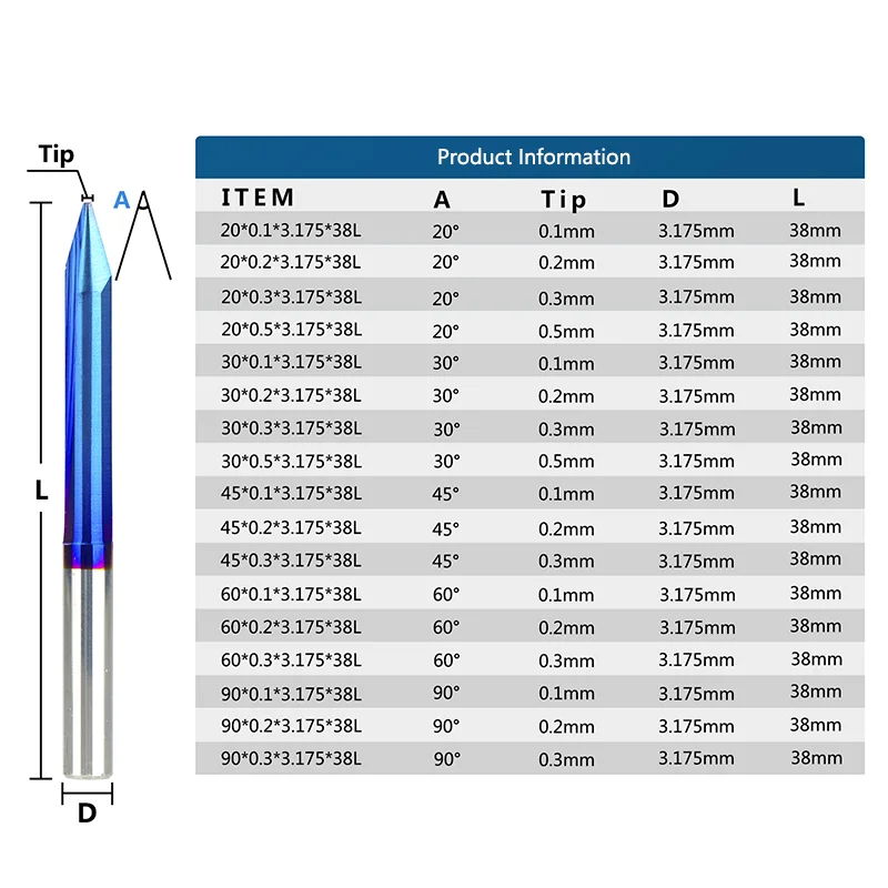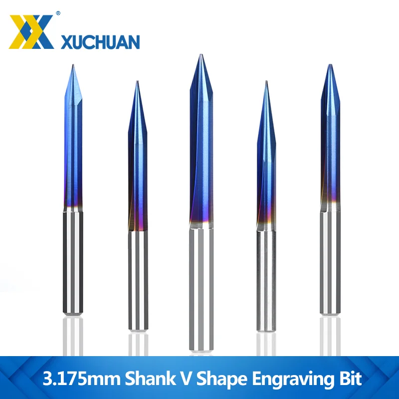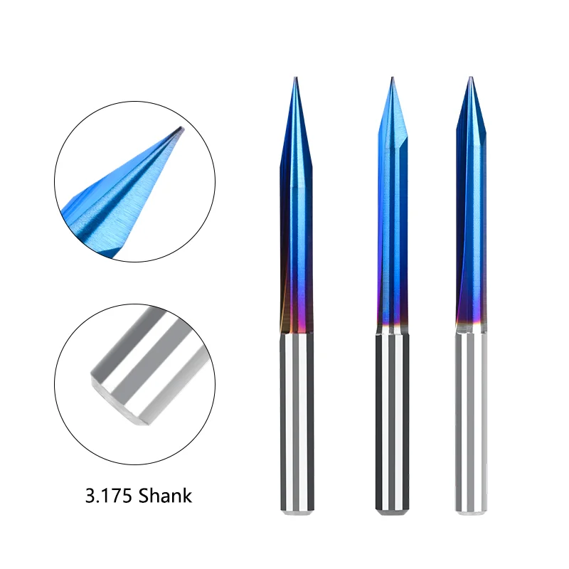 V Форма Гравировальный Бит 3,175 мм хвостовик 2 Флейта прямой конец Мельница Нано синее покрытие CNC резьба бит карбида фреза