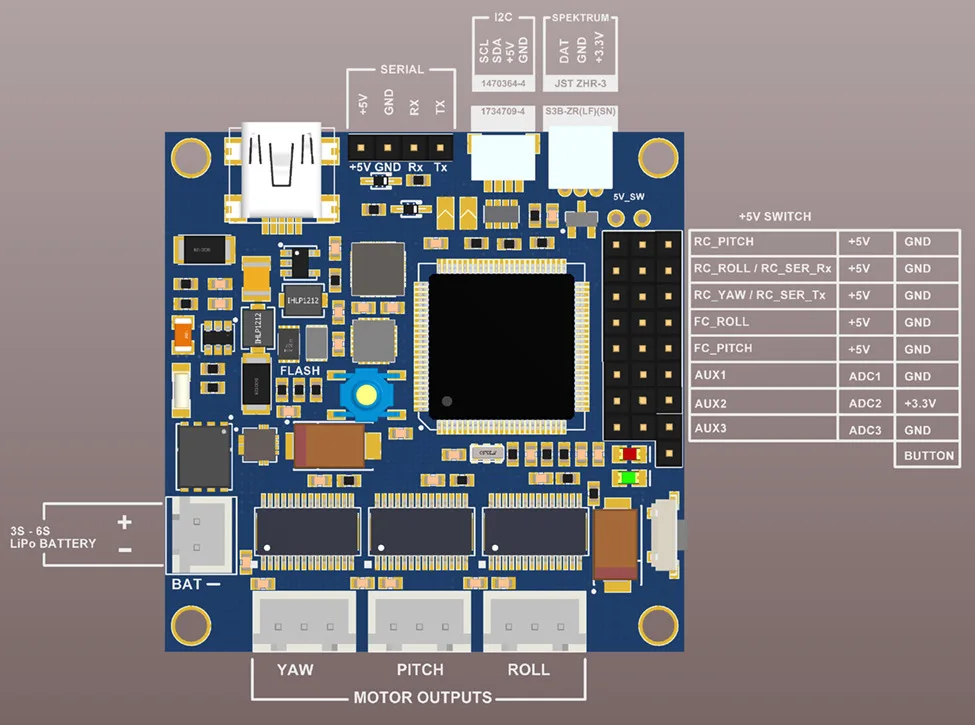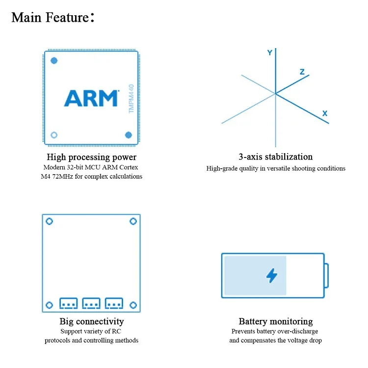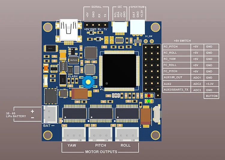 Новые возможности:Встроенный каркас IMUДатчик тока для измерения энергопотребления батареиCAN-bus для замены I2C для датчика IMU и других периферийных соединенийВыделенные порты 3x SPI/PWM для подключения кодировщикаДополнительный I2C порт для подключения 2-го IMU или кодеровВстроенный звуковой сигналПоддерживается до 6с LiPo батарея Характеристики:Размер платы: 50 × 50 ммРасстояние между монтажными отверстиями: 45 ммДиаметр монтажных отверстий: 3 ммНапряжение источника питания: 8-26 в (3s-6s LiPo)Максимальный ток двигателя: 1,5 А5 в выходной ток для питания внешних устройств: до 1 А3 в выходной ток: 150 мА Посылка включает в себя:-1 панель управления с шарнирным замком для BaseCam SimpleBGC 32-бит прогноз погоды-1 камера IMU & NEccessory провода