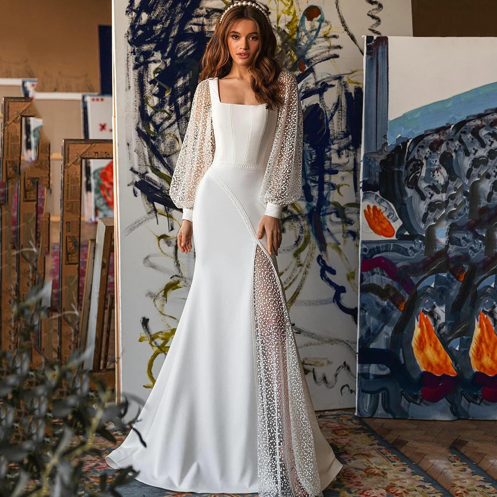 Атласные и блестящие свадебные платья из тюля цвета слоновой кости, с квадратным вырезом и длинными пышными рукавами, свадебные платья, сексуальное платье невесты с открытой спиной и бисером