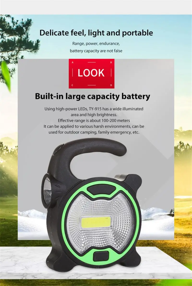 Используя Мощные светодиоды, TY-915 имеет широкую область облучения и высокую яркость и эффективный диапазон около 100-200 метров. Он может использоваться в различных суровых условиях, и используется для кемпинга на открытом воздухе, семейных чрезвычайных ситуаций и т. д.