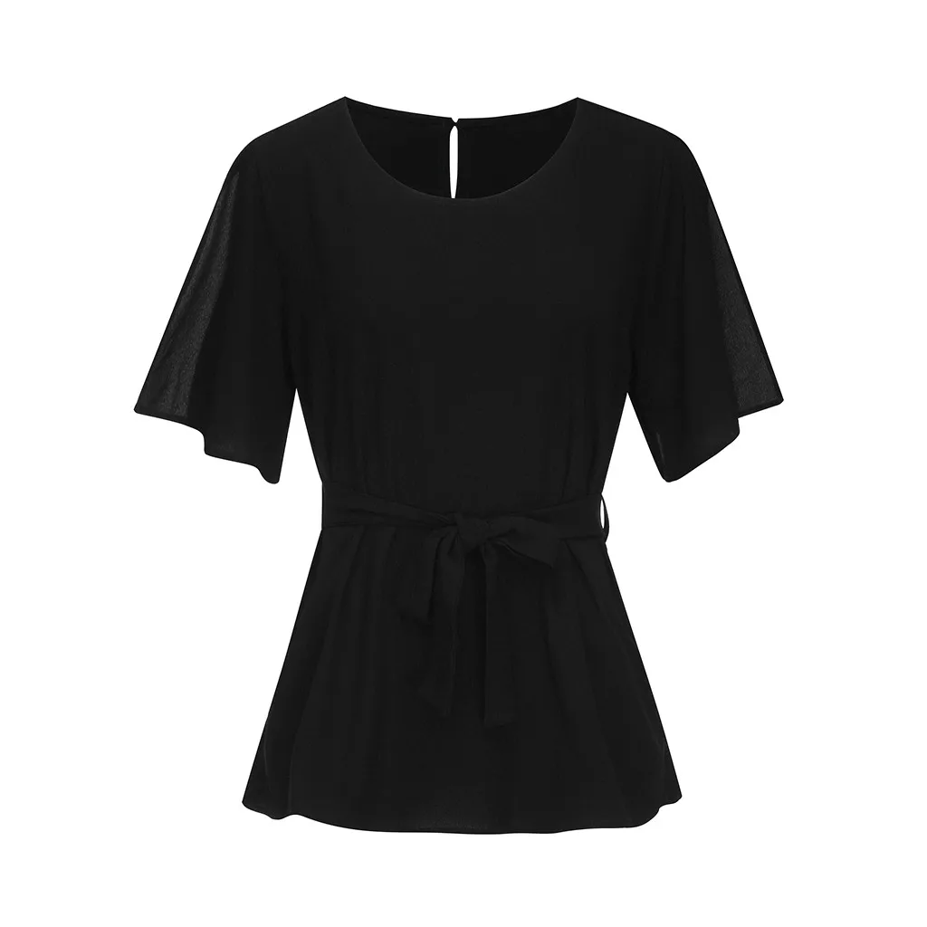 Блузка женская однотонная с коротким рукавом, с поясом и узлом