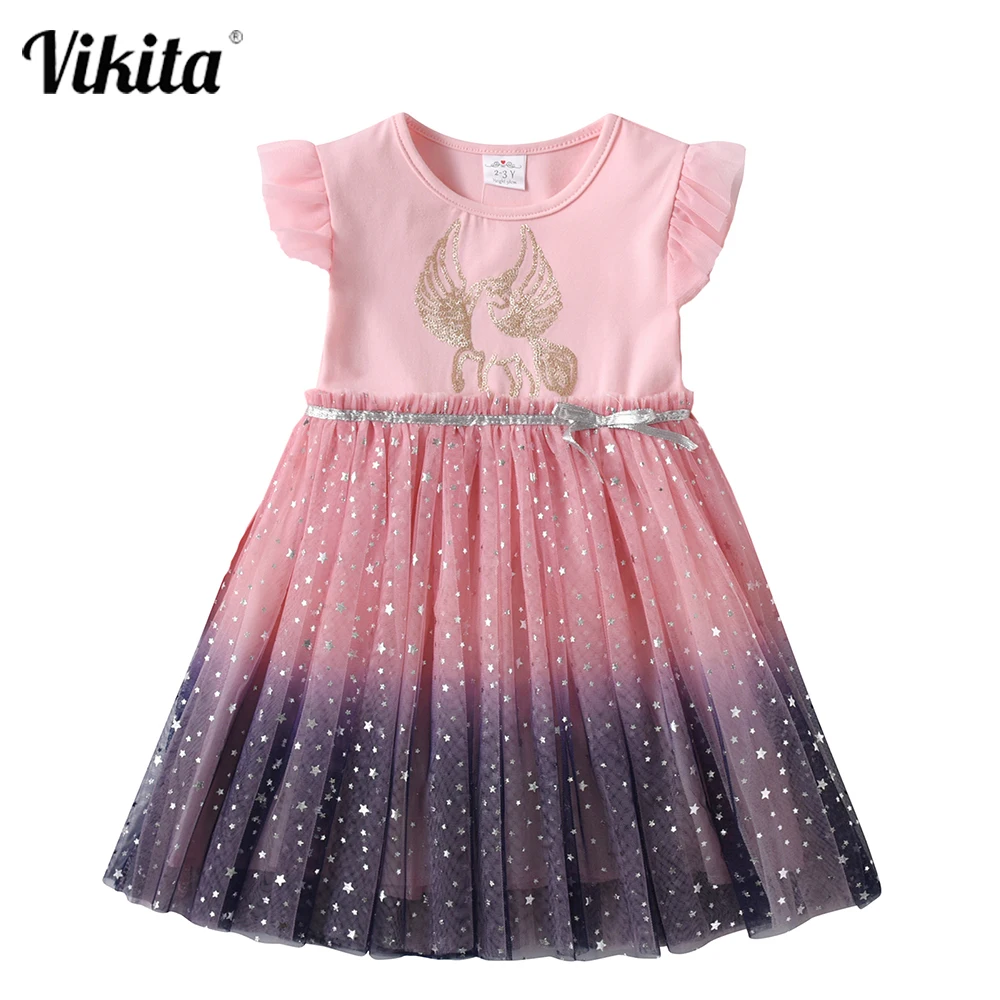 Летнее платье для девочек; Детские повседневные платья с героями мультфильмов; Платье с принтом единорога для девочек; Детские вечерние сетчатые костюмы принцессы с блестками для дня рождения