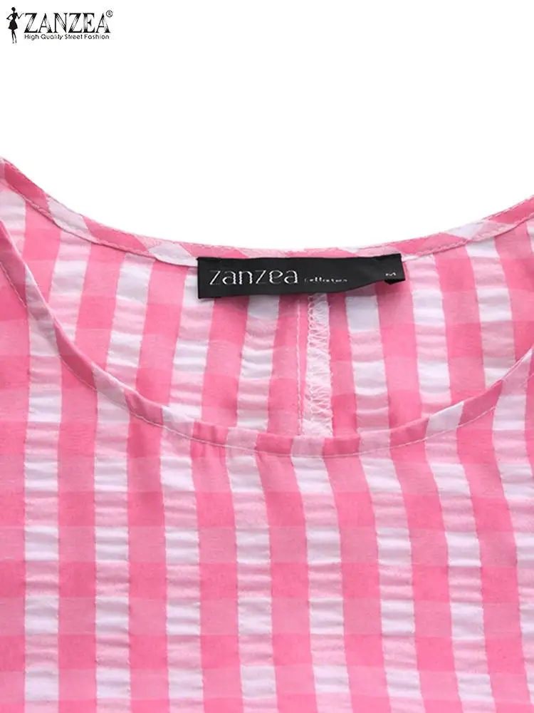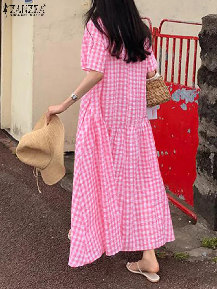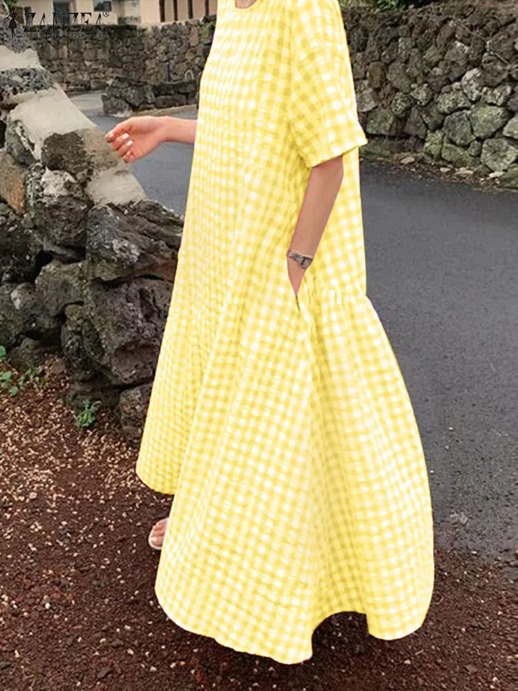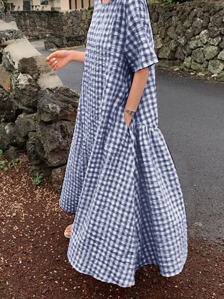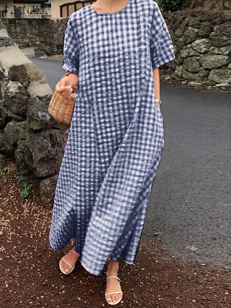 Платье ZANZEA женское клетчатое в клетку, модный праздничный свободный сарафан с карманами, с коротким рукавом и круглым вырезом, лето 2022
