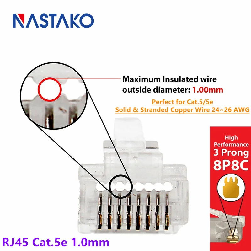 Бренд: NASTAKO24K полный позолоченный 3 зубец неэкранированный RJ45 модульный разъем.8P8C сетевой кабель RJ45 разъем.Диаметр отверстий: Φ 1,0 мм.Подходит для Cat.5 / Cat.5e круглых и плоских кабелей UTP (AWG 24 ~ AWG 26).24K полностью Позолоченные 3 зубчатые листы для лучшей передачи данных и более высокого уровня сигнала.