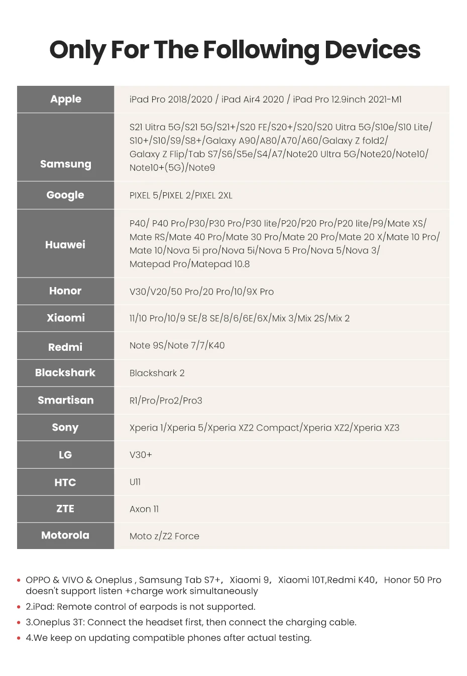 Tab S7/Tab S6/Tab S5E/Tab S4Для Apple: iPad Pro 2020/2018, iPad Air 4Для Google: Pixel 5/4/4 XL/3/3 XL/2/2 XL(Не поддерживает пиксель 6)Для Huawei: