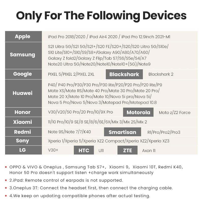 【 2 】 OPPO & VIVO, Samsung Tab S7 +, Xiaomi 9, Oneplus 7 Pro, не поддерживает одновременную работу прослушивания и зарядки.