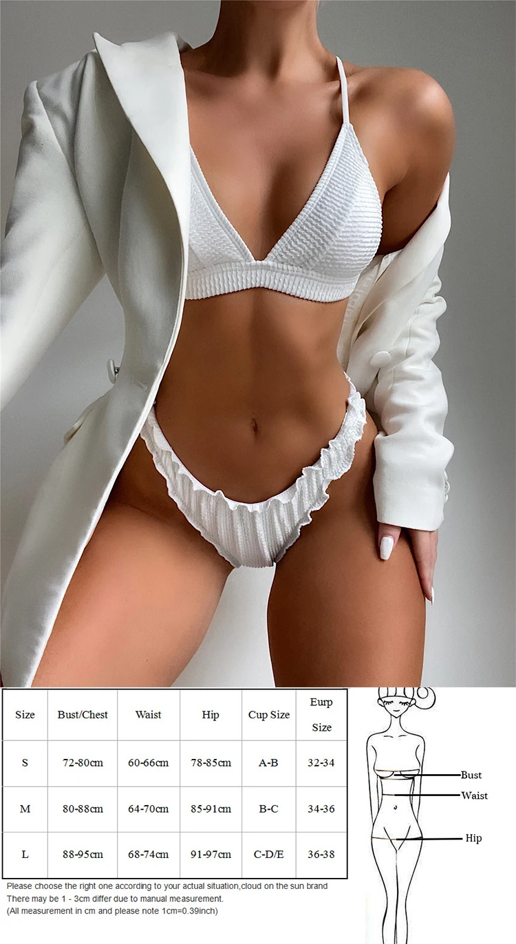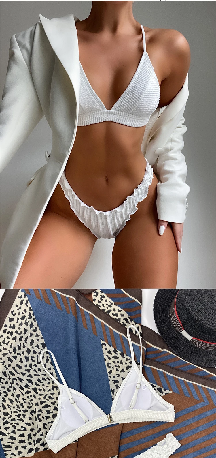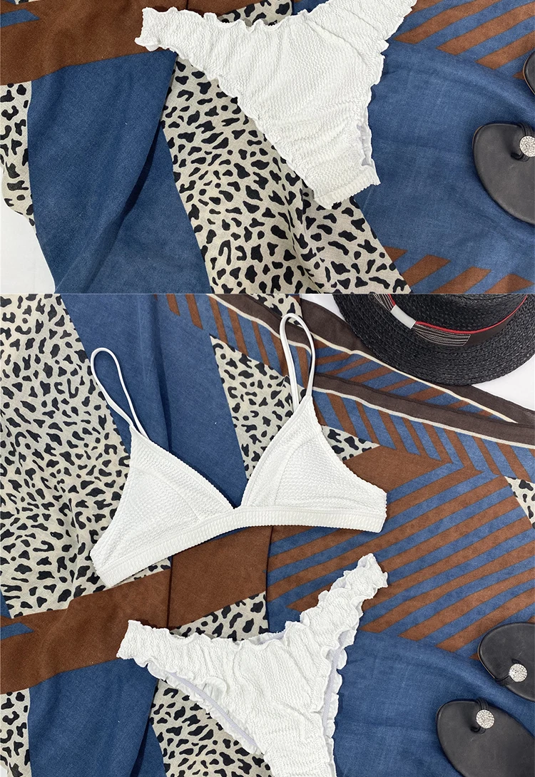 Новинка 2022, однотонное белое бикини, 2 предмета, штаны с оборками, стринги, сексуальный купальник, плиссированный удобный тканевый женский купальник с пуш-ап в рубчик