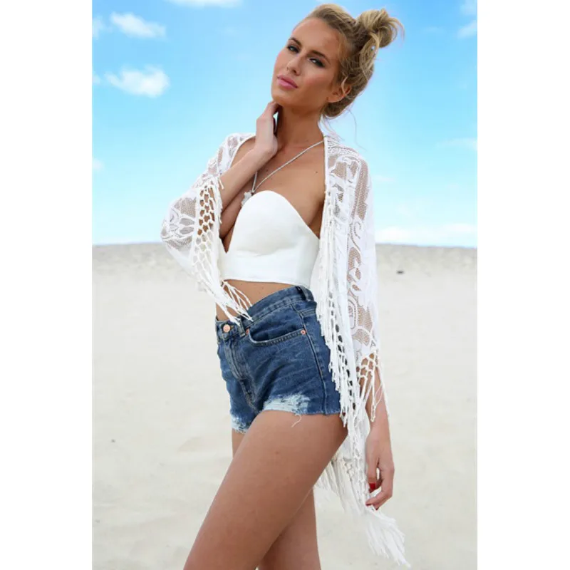 2016 белые сексуальные женские кружевные крючком купальные костюмы бикини с кисточками накидка женское пляжное платье купальный костюм пляжный купальник накидка