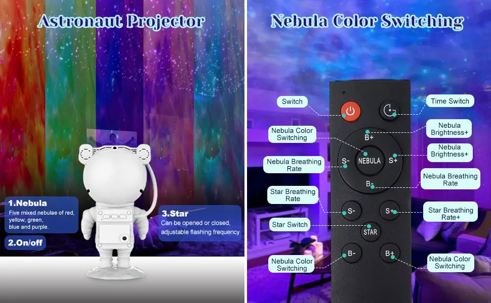 ★Лучший подарок: Проекционные Огни космонавта подходят для дней рождения, вечеринок, свадеб, украшения комнаты, дня детей, Рождества и юбилейных подарков. Звездное небо, проекция галактических огней создают чудесную звездную атмосферу и помогают стимулировать детское любопытство, воображение и творчество. Он также очень подходит как Звездный проектор, романтическая лампа настроения, Ночной светильник или прикроватная лампа для украшения интерьера.★Проекционная лампа астронавта: сочетание туманности и звездного света можно воспроизводить отдельно или в комбинации, а эффект потока туманности создает расслабляющую среду. Его можно использовать в качестве проекционной лампы с изысканным внешним видом или высококлассным орнаментом. Это также идеальный выбор для коллекционеров.★Дистанционное управление и таймер: проекционная лампа космонавта звездного неба с пультом дистанционного управления может управлять режимами включения/выключения туманности и звездного света. Вы можете настроить яркость, изменить режим светильник, и он может отображать различные эффекты туманности. И вы также можете регулировать скорость и яркость туманности. Два режима синхронизации: около 40 мин и около 90 мин, автоматическое выключение, вы можете легко получить доступ к этим настройкам, не вставляя.★Простота в использовании: головка проекционной лампы астронавта может быть перемещена и разобрана, а звездное небо и Туманность могут быть спроектированы под любым углом по желанию, обеспечивает чудесную и мечтательную среду для вашей однообразной спальни или игровой комнаты.★Гарантия качества: Если вы обнаружите какие-либо проблемы с проекционной лампой астронавта, такие как дефектные или поврежденные детали до или после использования, пожалуйста, свяжитесь с нами.