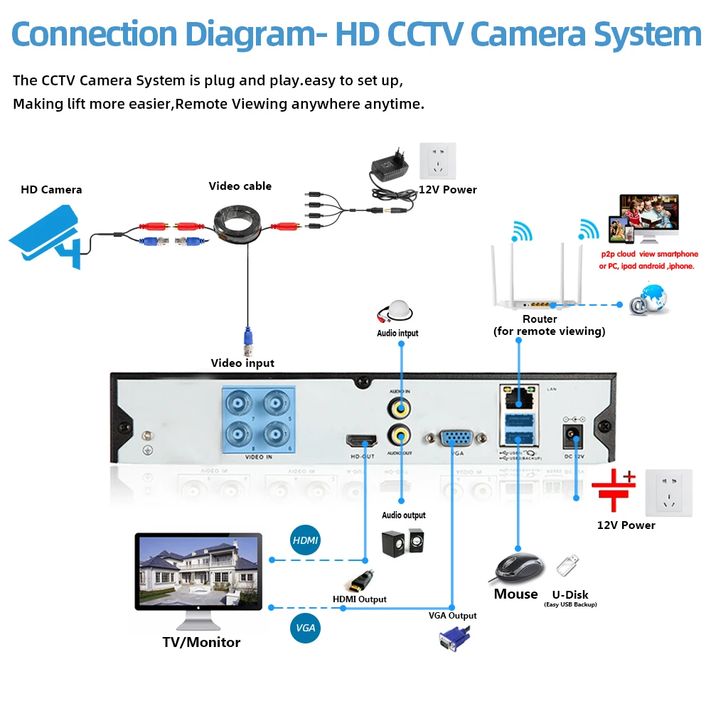 Простая настройка, всего 4 шага для просмотра мобильный телефон, просмотра видео в режиме реального времени из любого места и в любое время с помощью смартфона,Таблица или ПК с передовой технологией P2P, вы можете получить удаленный доступ к вашей системе в течение нескольких минут или меньше, нет необходимости в переадресации,Удаленный доступ никогда не был таким простым!