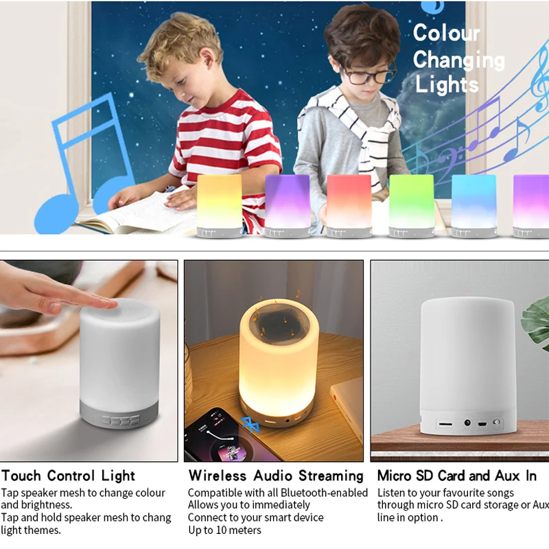 1. Интеллектуальная совместимость, быстрое Сопряжение Bluetooth-совместимое воспроизведение, стерео качество звука без потерь.2. Сенсорный pat для регулировки светильник, три класса яркости, красочный цвет, ночной Светильник для сна.3. Встроенный микрофон, громкоговоритель, технология шумоподавления.