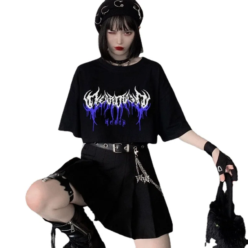 Женские футболки в стиле панк, Корейская футболка, готическая Черна...