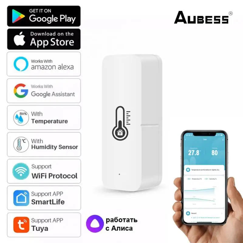 Датчик температуры и влажности Aubess Tuya, дистанционное управление через приложение Tuya Smart Life, работает от батареек ALexa Google
