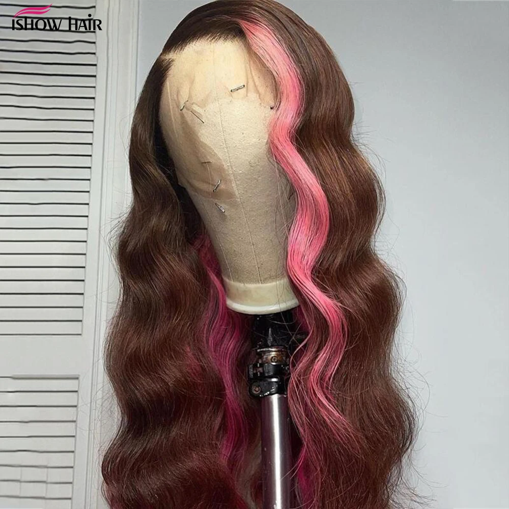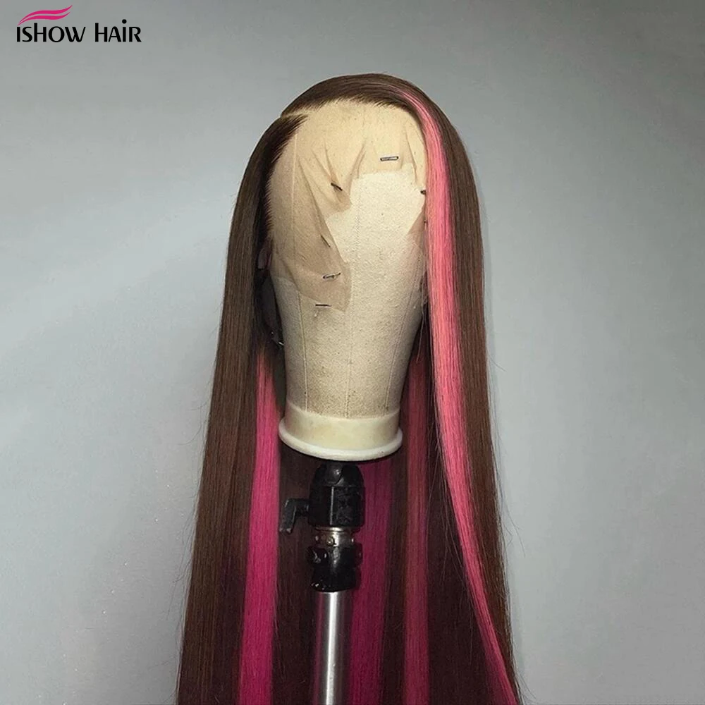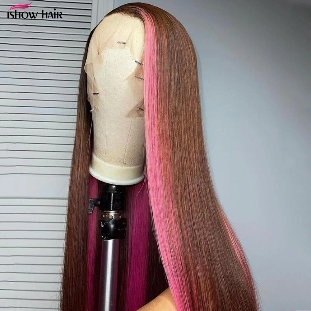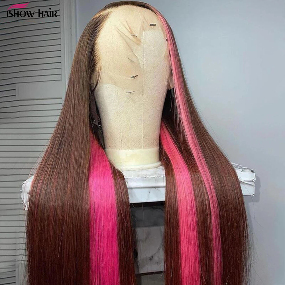 Парик женский прямой из натуральных волос, каштановый и розовый на сетке, 30 дюймов, HD 13X 4