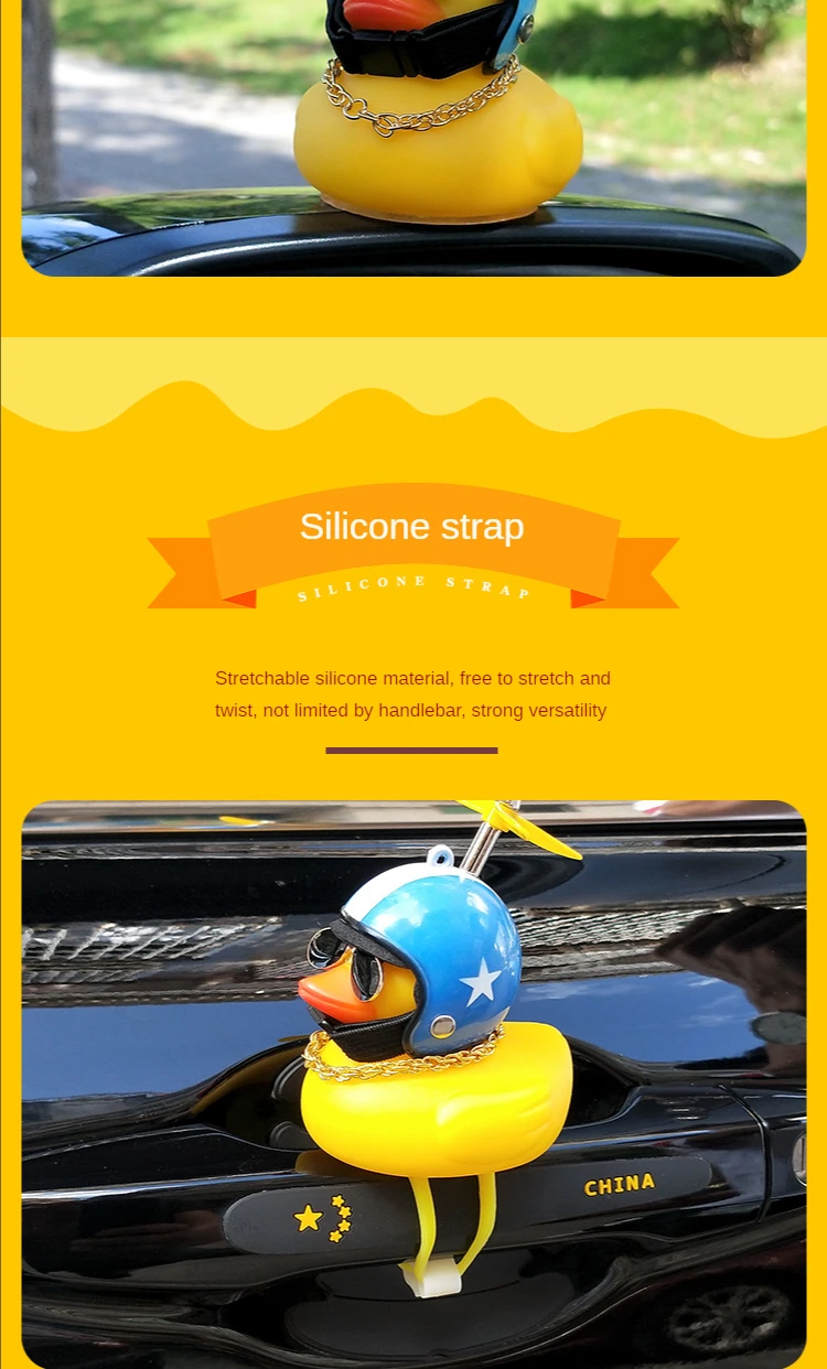 Список поставки:1 шт. желтая утка1 шт. х шлем1 шт. x Airscrew1 шт. x Солнцезащитные очки1 шт. x цепьНаклейка-1 шт.Эта утка не имеет огней и больше подходит для автомобилей, велосипедные ремни необходимо приобретать отдельно