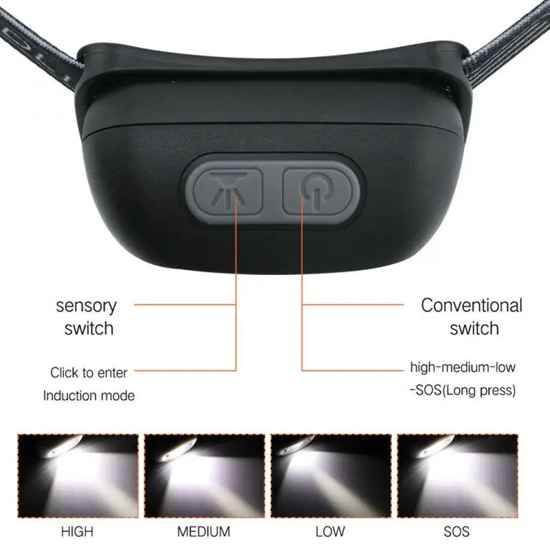4. Датчик: Этот перезаряжаемый налобный фонарь может быть включен/выключен, развевая руку под режимом датчика движения. Удобно выключить светильник, чтобы не повредить глаза вашего друга в темноте. Головка лампы V800 с красным светодиодным светильник очень яркий, вы можете увидеть детали на расстоянии до 110 метров.