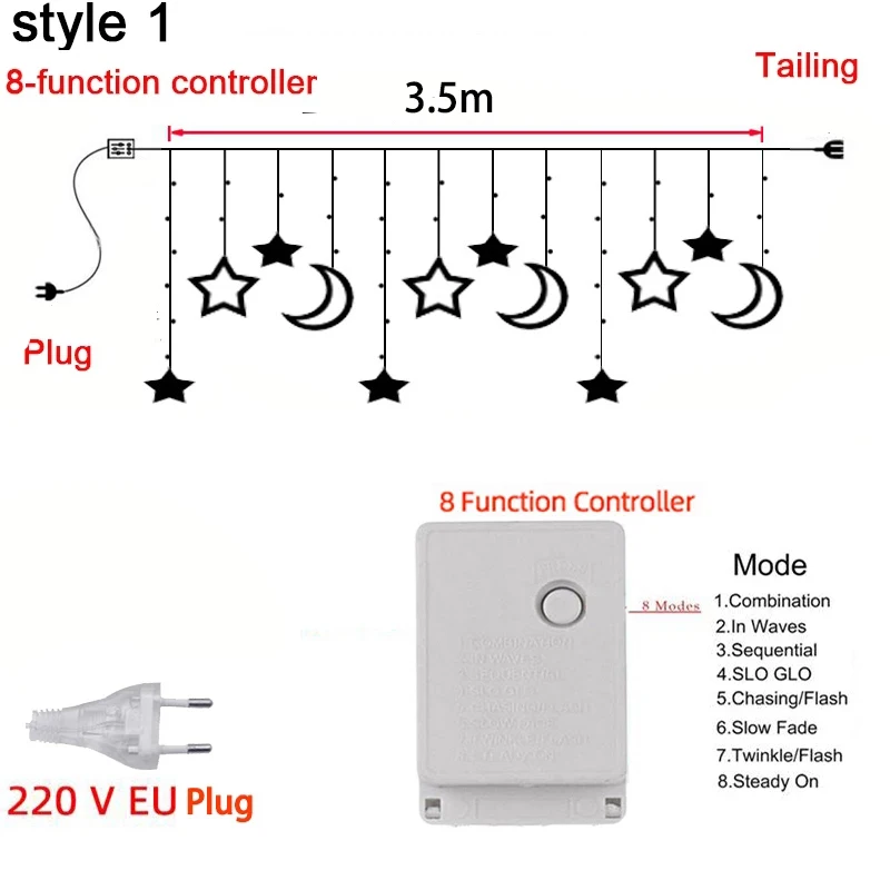 Характеристики:Стиль 1: светодиодный светильник для рождественской занавескиЦвет: теплый белый, разноцветныйВодонепроницаемость: IP44Материал: медная проволока + пластиковая крышкаДлина: 3,5 мВысота: 0,35 М-0,9 мНапряжение: 220 В переменного токаСтандарт штепсельной вилки: штепсельная вилка европейского стандартаСвинцовый провод (линия): 1,5 м8 режимов • Питание: 1. Постоянный светильник режим 2. Режим вспышки 3. Мигающий режим 4. Непрерывный режим 5. Режим волны 6. Fantasy 7. Свое существование режим 8. Медленный режим вспышки