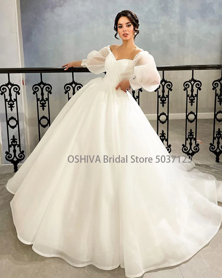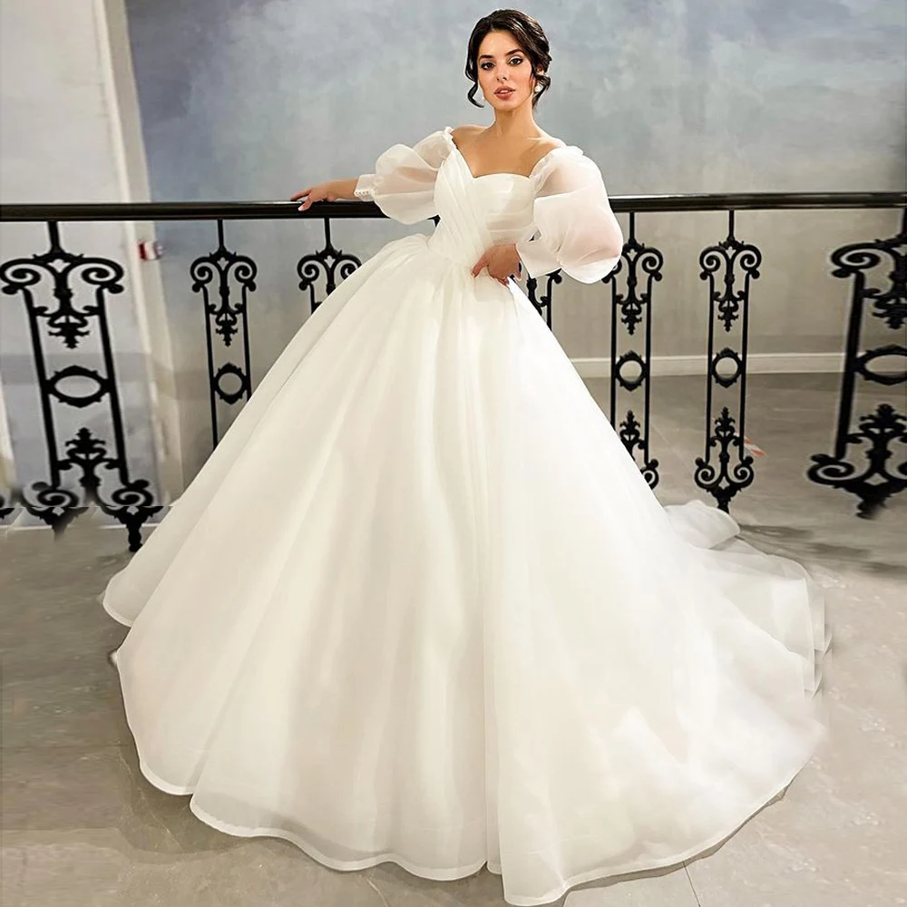 Бальное платье из органзы, свадебные платья, пышные рукава, съемные с открытыми плечами, плиссированные, со шнуровкой сердечком, свадебные платья со шлейфом