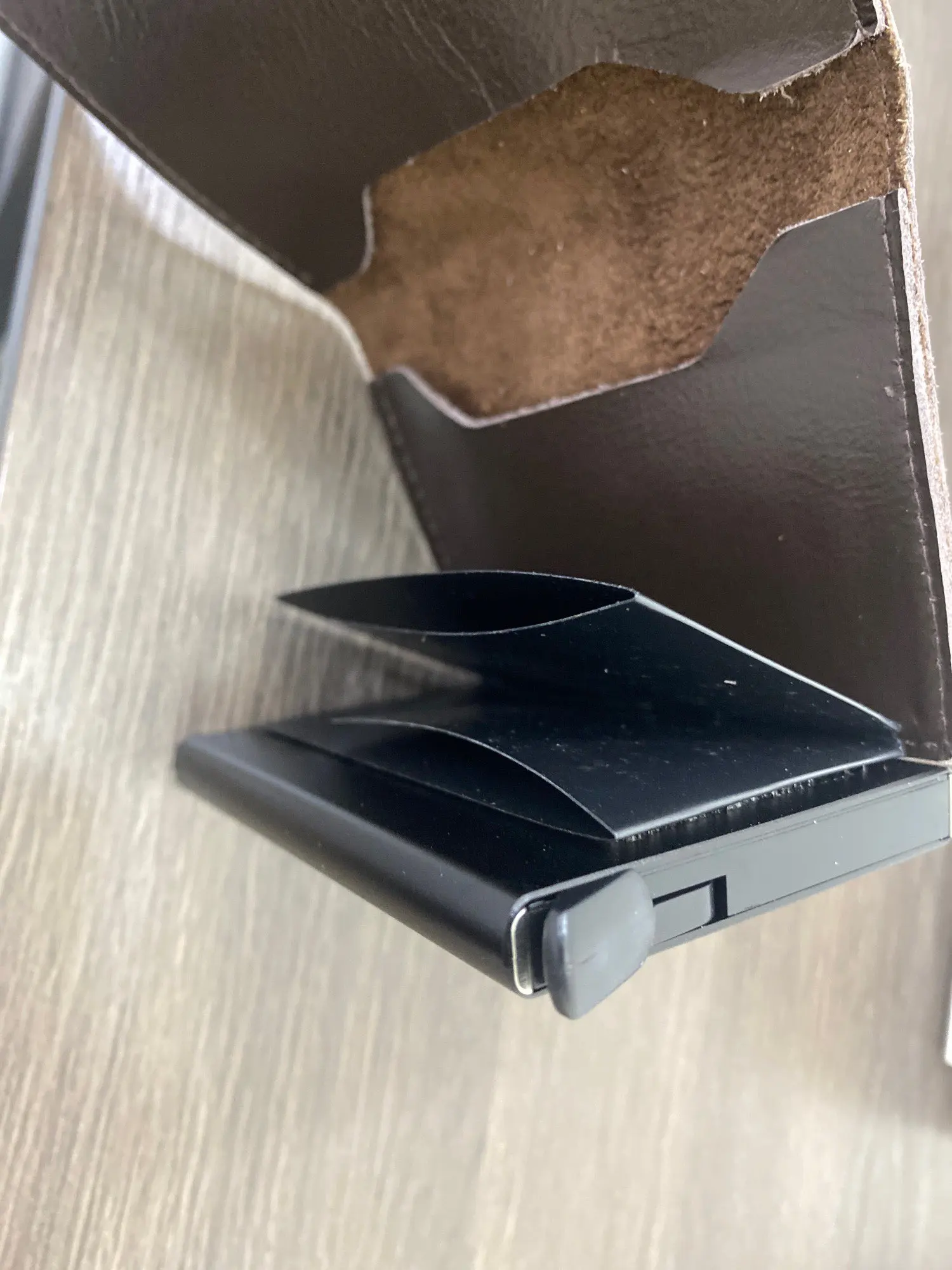 Я прибываю раньше, чем ожидалось, кожа, с множеством «слотов», чтобы положить карты, деньги, билеты и другие, достаточно качества, с гравировкой спереди ....