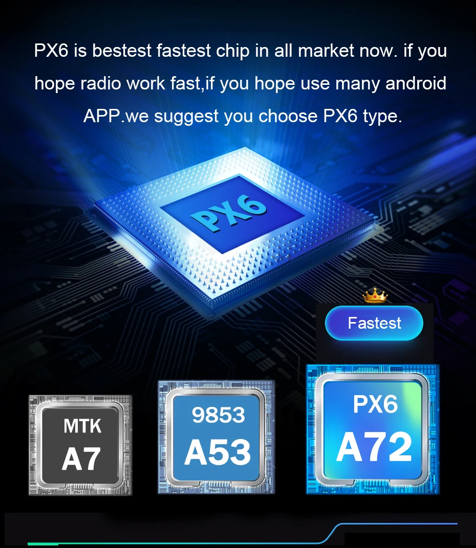 Процессор PX6PX6-лучший чип на всех рынках в настоящее время, он работает быстрее, чем все другие типы. Балл ANTUTU 160770, он лучше, чем 7853 4G + 64G, он лучше, чем PX5, он лучше, чем все другие типы 4 + 64G на всех рынках. PX6 radio может загружать больше видов приложений для android с рынка android, и приложение может работать лучше, чем другие типы радио.