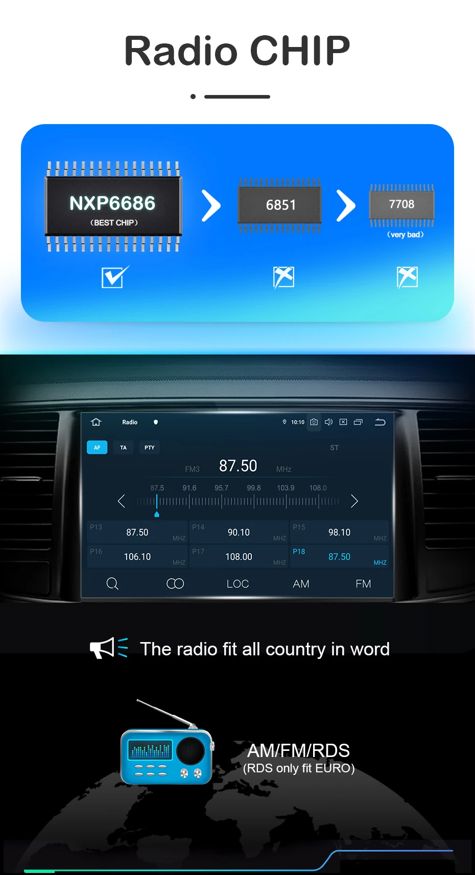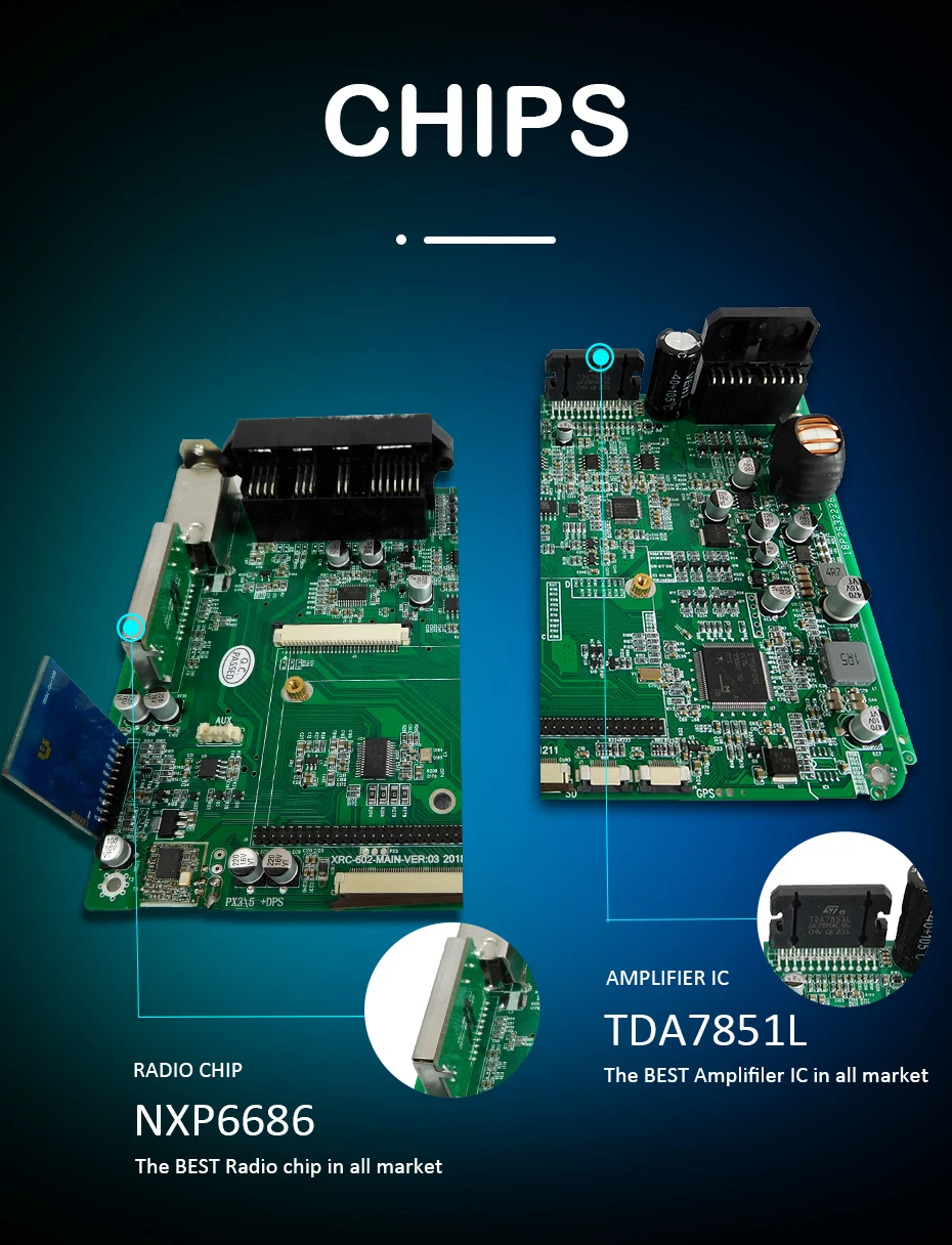 Чип радио и усилительРадио использует лучшие радио chip-NXP6686 и лучший усилитель chip-TDA7851L.Чип NXP6686 лучше than7708,6851 или любой другой радиочип, это лучший радиочип на рынке в настоящее время. Хороший радиочип делает радиосигнал более сильным.TDA7851L является лучшим амплитудным IC на рынке в настоящее время. Лучше, чем 7388 и все остальные. Качество звука автомобиля лучше, чем у других типов радио. Если вам нужно лучшее качество звука, мы предлагаем вам также выбрать функцию DSP, DSP-это система цифрового усилителя, она предлагает лучшее качество звука.