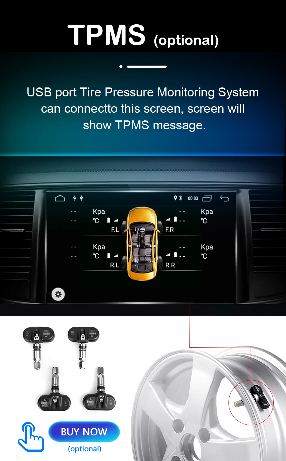 TPMSРадио может совместимо с системой контроля давления в шинах (TPMS). Когда вы подключаете TPMS к радио, вы можете видеть, что TPMS приводит к радиоэкрану. Радио также совместимо с внутренними TPMS и внешними TPMS. Если вы хотите купить TPMS, нажмите на эту фотографию.