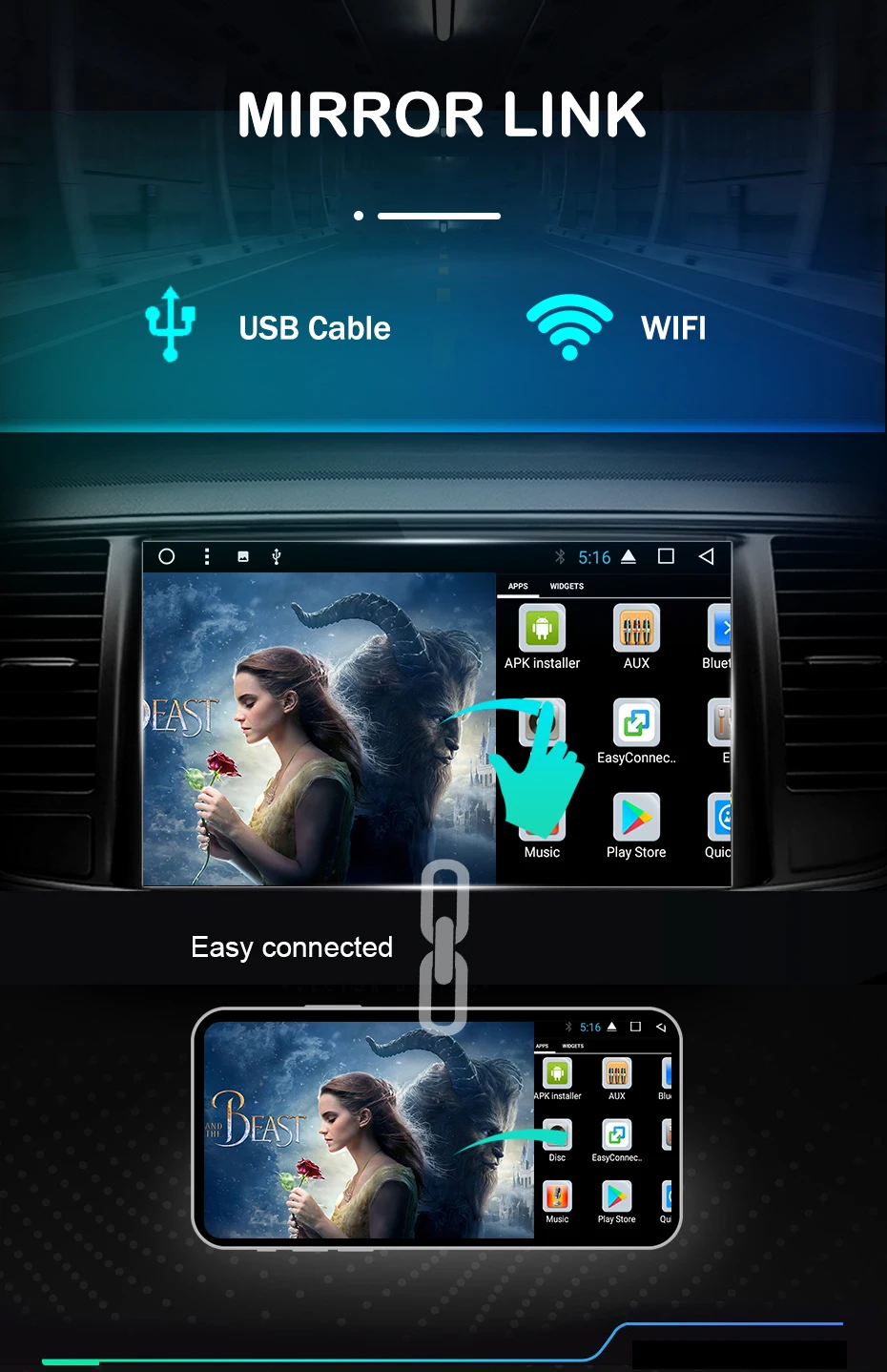 Зеркальное соединениеПодключите ваш мобильный телефон к этому радио с помощью функции зеркальной связи, радиоэкран покажет мобильный телефон, как зеркало. И радио может управлять ваш мобильный телефон, так что вы можете слушать мобильный телефон музыку или совершать звонки через Радио экран после их подключения.