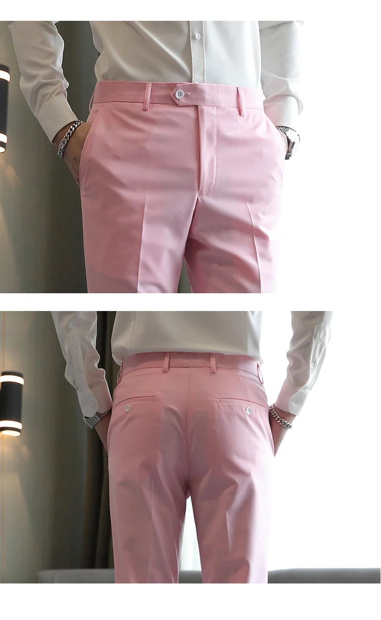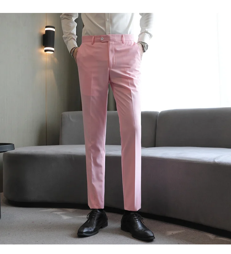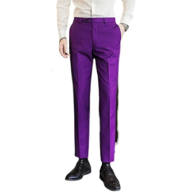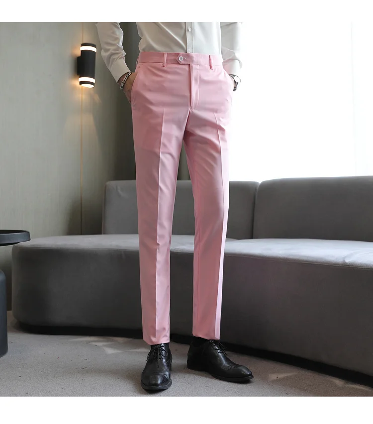 Зеленые однотонные брюки; Весенние мужские брюки; Роскошные универсальные брюки; Брюки в британском стиле; Мужские узкие брюки; Цвет розовый, фиолетовый, красный