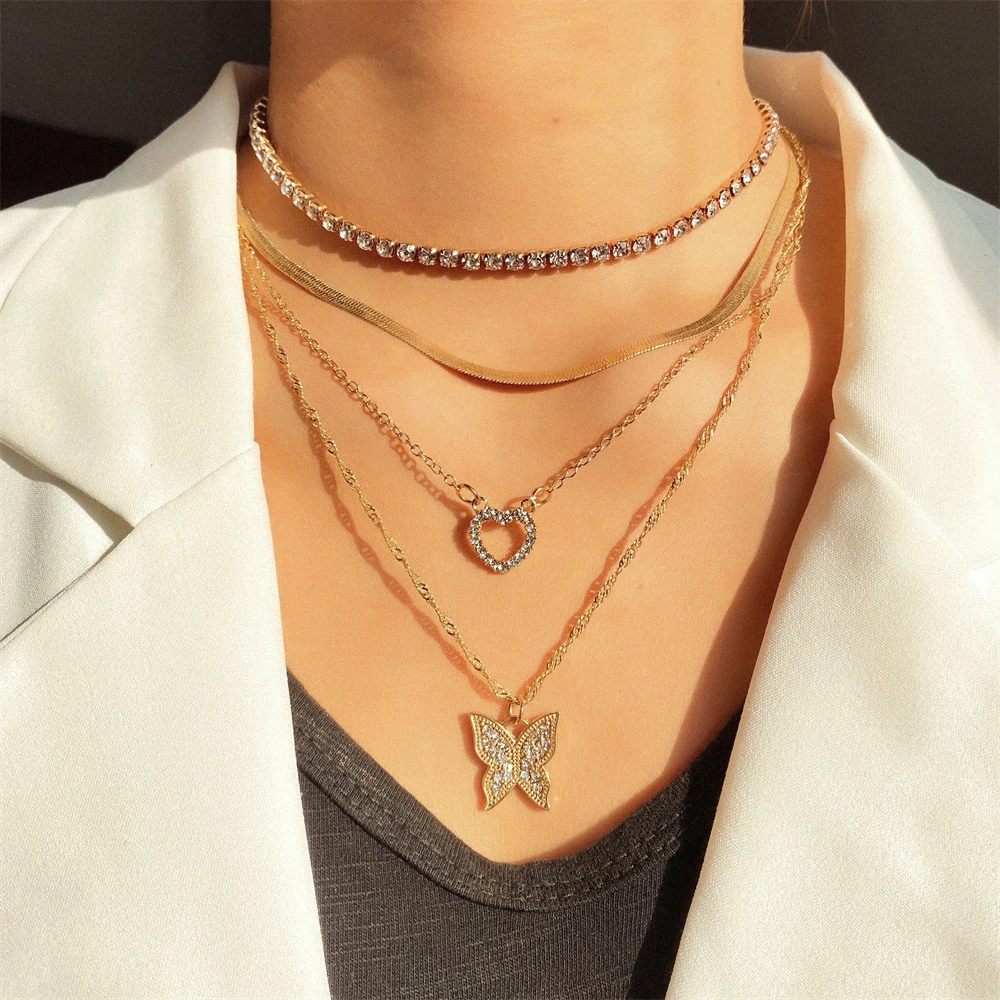 Модное многослойное ожерелье FNIO с подвеской в виде любящего сердца и бабочки для женщин Золотая цепочка ожерелье-чокер подарки ювелирные изделия
