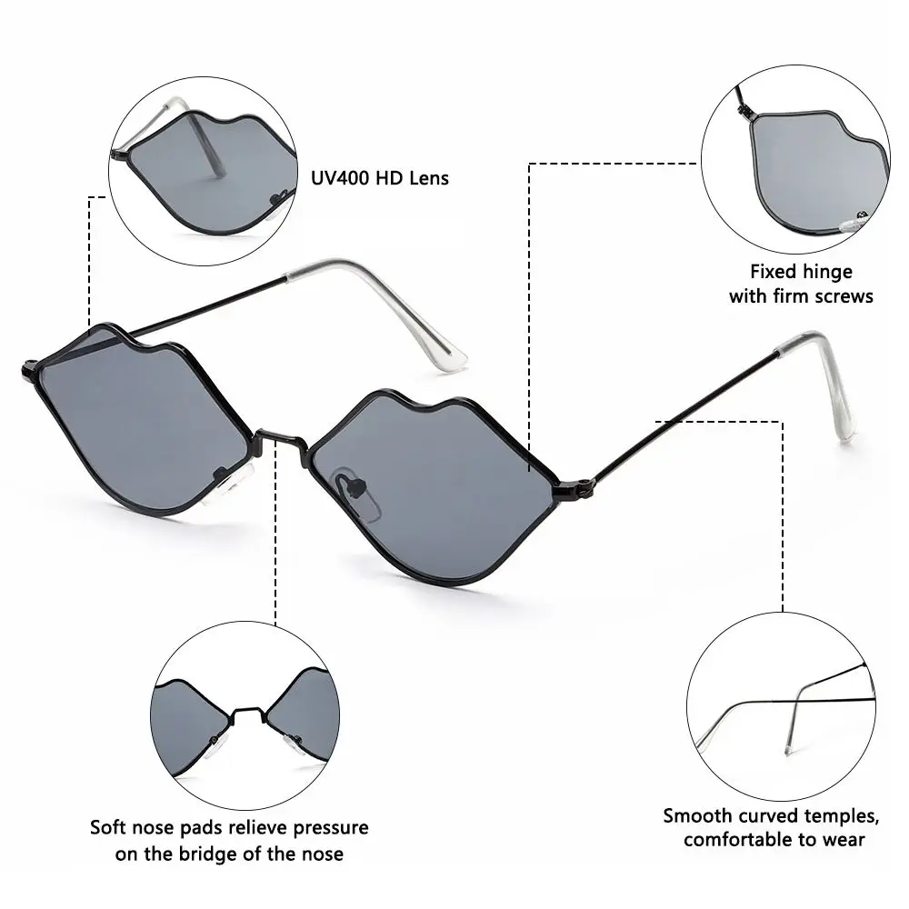 * Высокое качество-Необычные Солнцезащитные очки в форме сексуальных губ изготовлены из высококачественных материалов, которые удобно носить. Эргономичный дизайн, снимает давление на переносице. Усиленный шарнир предназначен для предотвращения ослабления винтов и делает солнцезащитные очки более гладкими, открытыми и закрытыми и выглядят более деликатными.